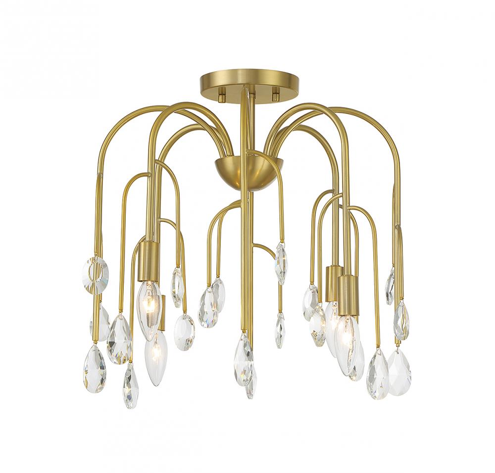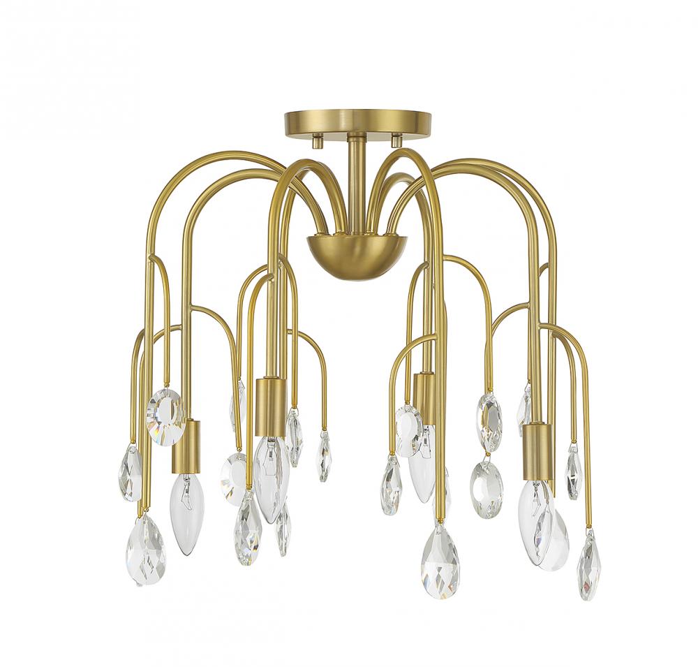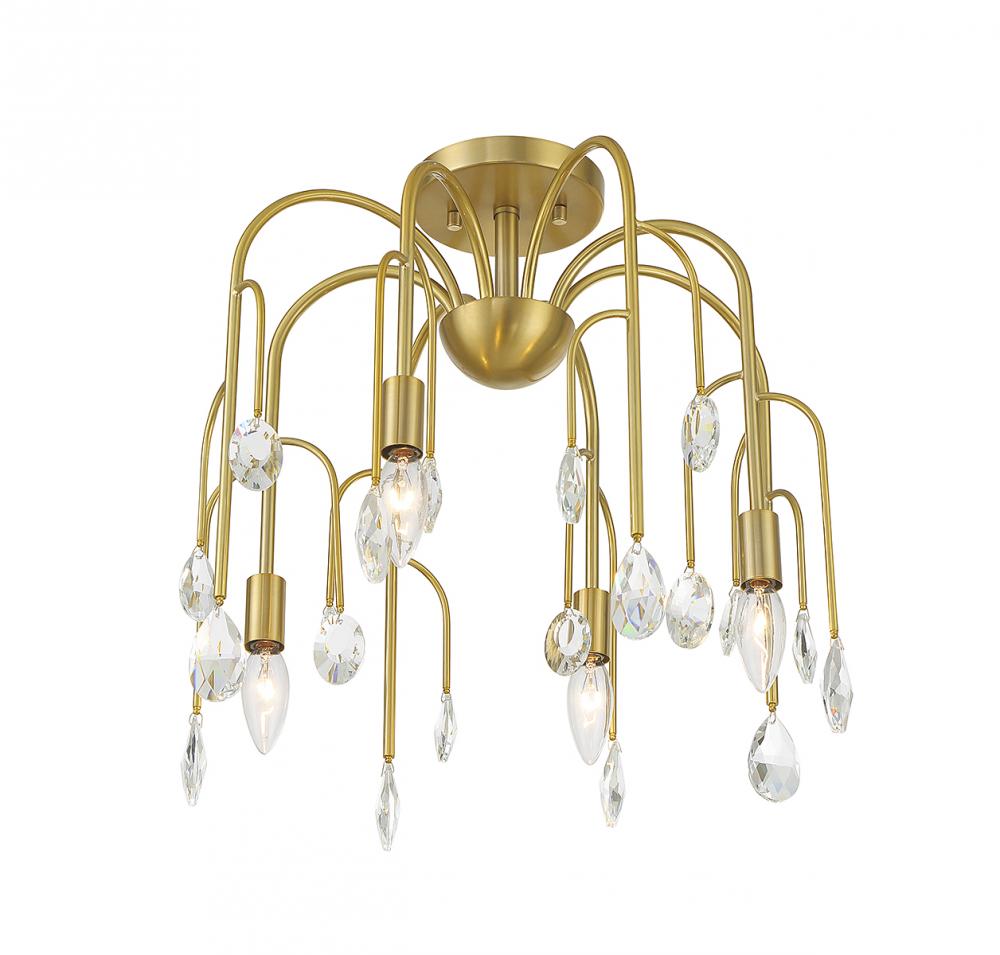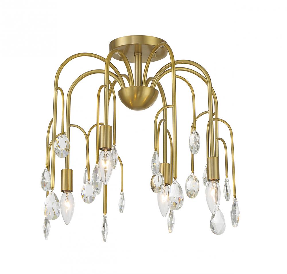 The Art Deco-inspired Savoy House Anholt 4-light convertible semi-flush mount is like a waterfall of glamour featuring curved branching arms adorned with faceted crystal drops in different shapes and sizes. Noble Brass finish. Anholt is 16.5" in width and has an adjustable height ranging from 16" to 69.5". It uses 4 candelabra size bulbs of up to 60 watts per bulb (bulbs not included). Comes with four 12" downrods and one 6" downrod. Can be used as a hanging pendant or ceiling light!