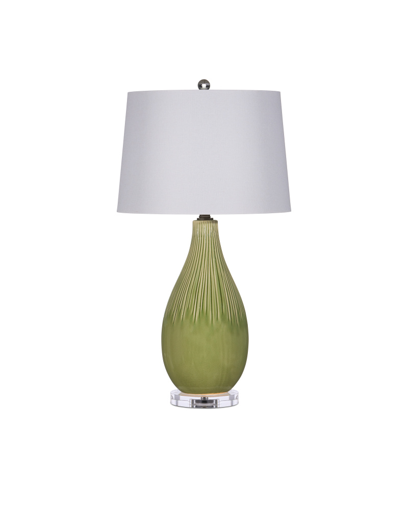 The Anjou Table Lamp is a glamorous creation made of ceramic with a rich green glazing that has been artfully applied to flow seamlessly down from the striations that are carved into the top section of the pear-shaped lamp. The optic crystal base and finial are luminous accents, and the satin brass finish on the hardware is warm in tone, as is the linen natural shade that tops the green lamp.