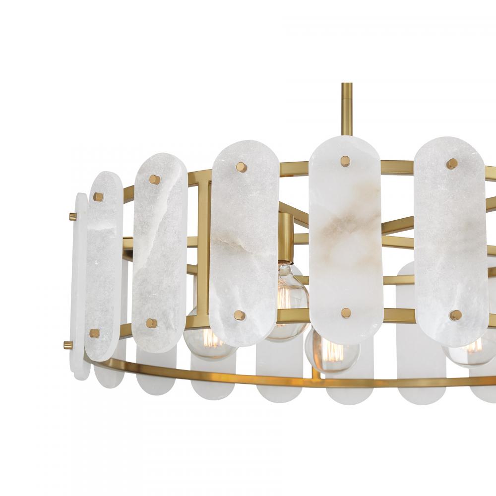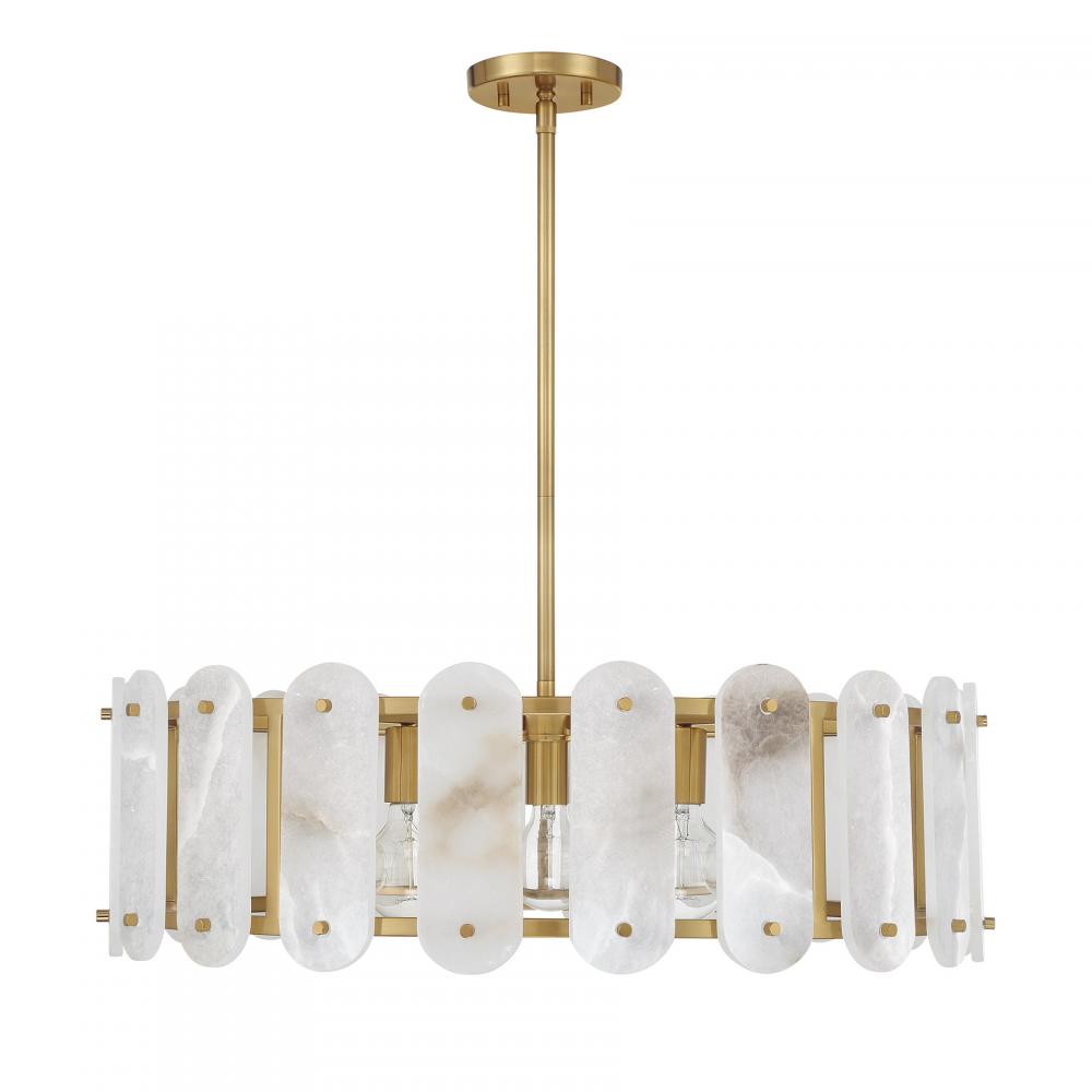 Discover spectacular lighting with the Savoy House Antolini 5-light pendant. Antolini is a reminder of the love and care that goes into sourcing precious materials from around the world. Panes of natural alabaster stone radiate ethereal warmth and vibrant veining, pairing perfectly with the Warm Brass finished structure to create a stunning style that is reminiscent of jewelry. Antolini is 28.5" in width and has an adjustable height ranging from 8.38" to 62.38". It uses five standard size bulbs of up to 60 watts per bulb. Bulbs not included. Comes with four 12" downrods and one 6" downrod.