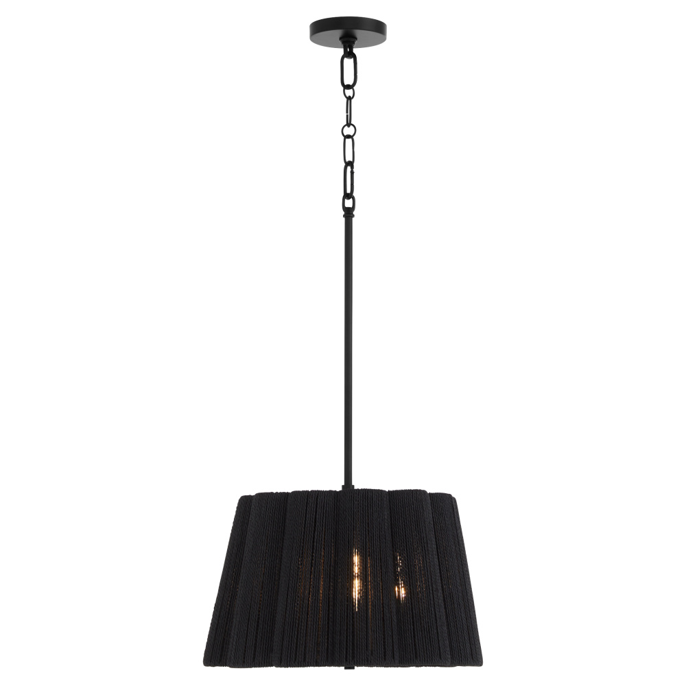 Anton blends natural texture with a modern silhouette, featuring a scalloped drum shade wrapped in natural fiber for a warm, diffused glow. A delicate stem extends from the top of the shade, connecting to a sleek, Figaro chain that enhances its refined appeal. Available in various finishes and sizes.
