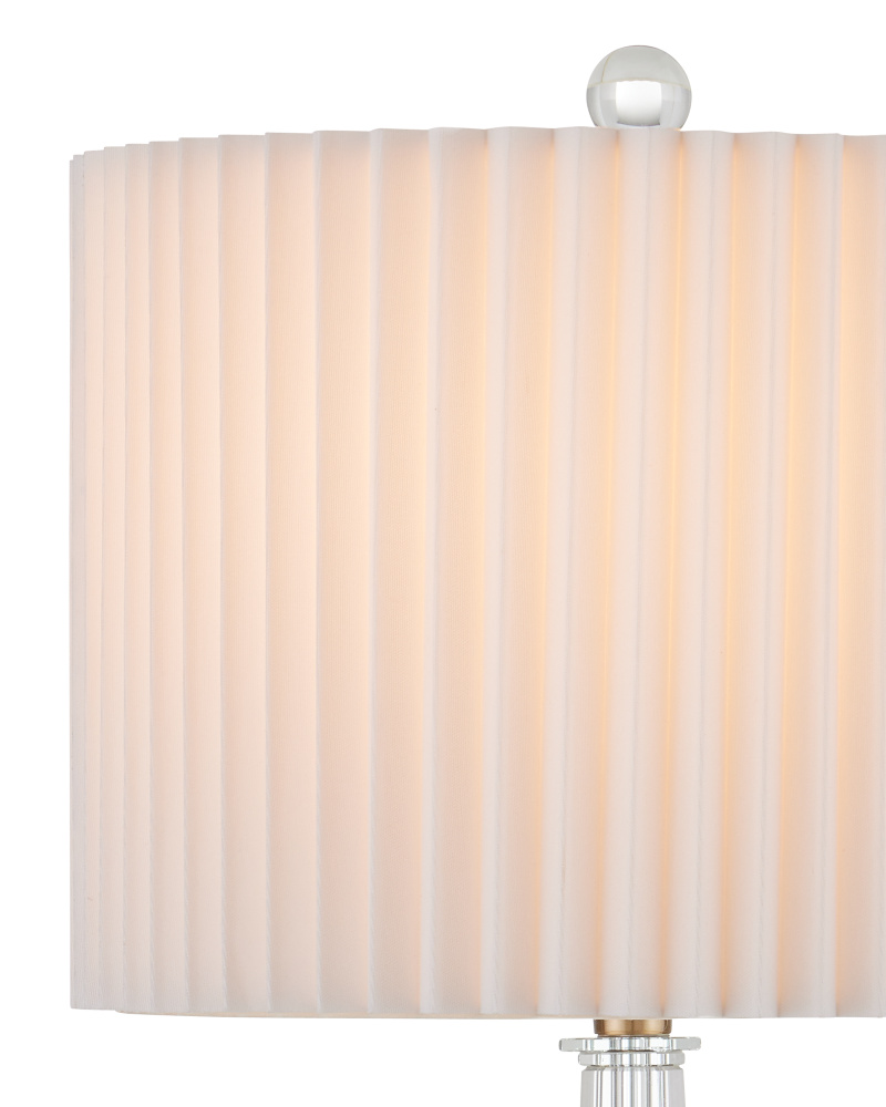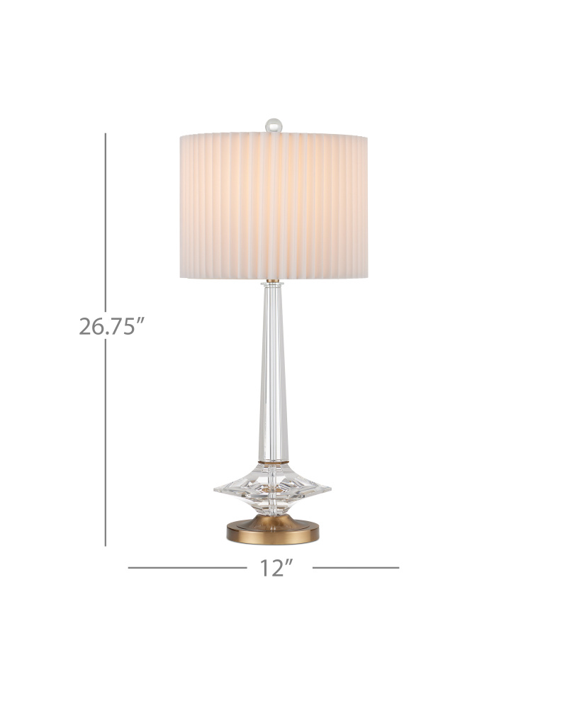 The Anton Table Lamp is made of lustrous optic crystal contrasted by metal accents in an antique brass finish. This includes the round base that beautifully supports a hexagonal swell and a thin ring of metal that cinches the geometric accent at the bottom of a thin stem, which narrows as it reaches the knife-pleated shade. A brilliant optic crystal finial attaches it to the clear lamp.