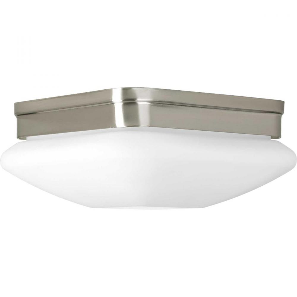 With an elevated style, the two-light 9 inch flush mount appeals to current home decor trends. Soft contemporary design includes square etched opal glass. Damp location listed. Brushed Nickel finish.