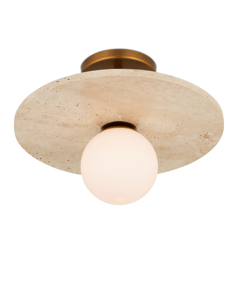 Inspired by a piece of jewelry, the Apricity Semi-Flush Mount features a frosted white cast-glass globe fitted to a travertine disc by metal hardware in an antique brass finish, reminiscent of a large pearl with its beautiful sheen. The simplicity of the profile leaves the glowing orb as the focal point of this design, while the way the illumination strikes the natural stone adds a clever aspect. The warmth of the metal draws out the subtle deeper tones in the travertine.