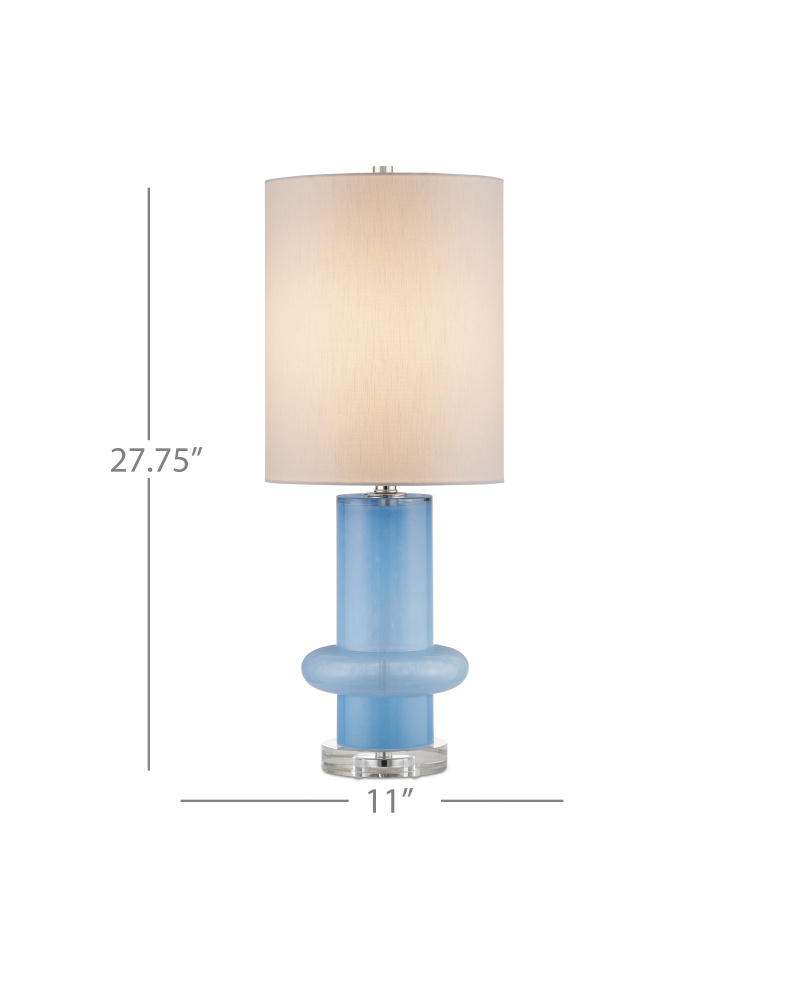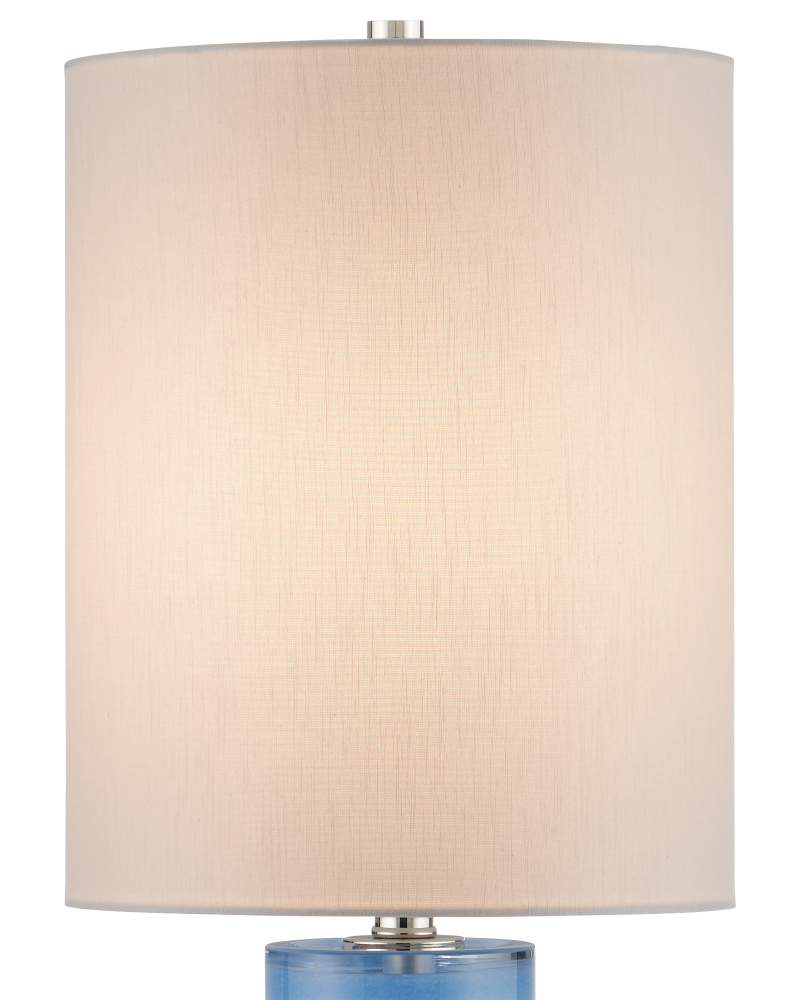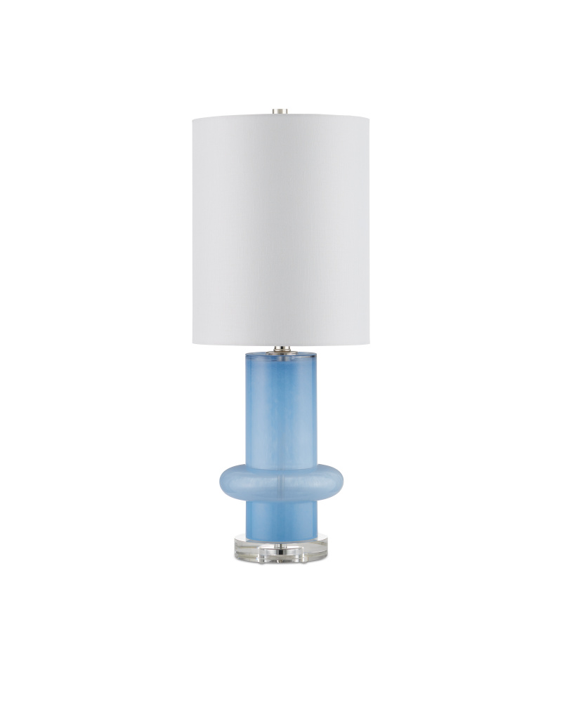 Made of a lively color of turquoise glass, the Aquaviva Table Lamp has a long columnar shape with a perfectly placed bulge as it approaches the optic crystal base on which it stands. The brightness of the base and the matching finial is echoed in the polished nickel finish on the hardware. The elongated shape of the shade is a nice design detail, as its scale is in sync with the height of the body of the blue lamp.