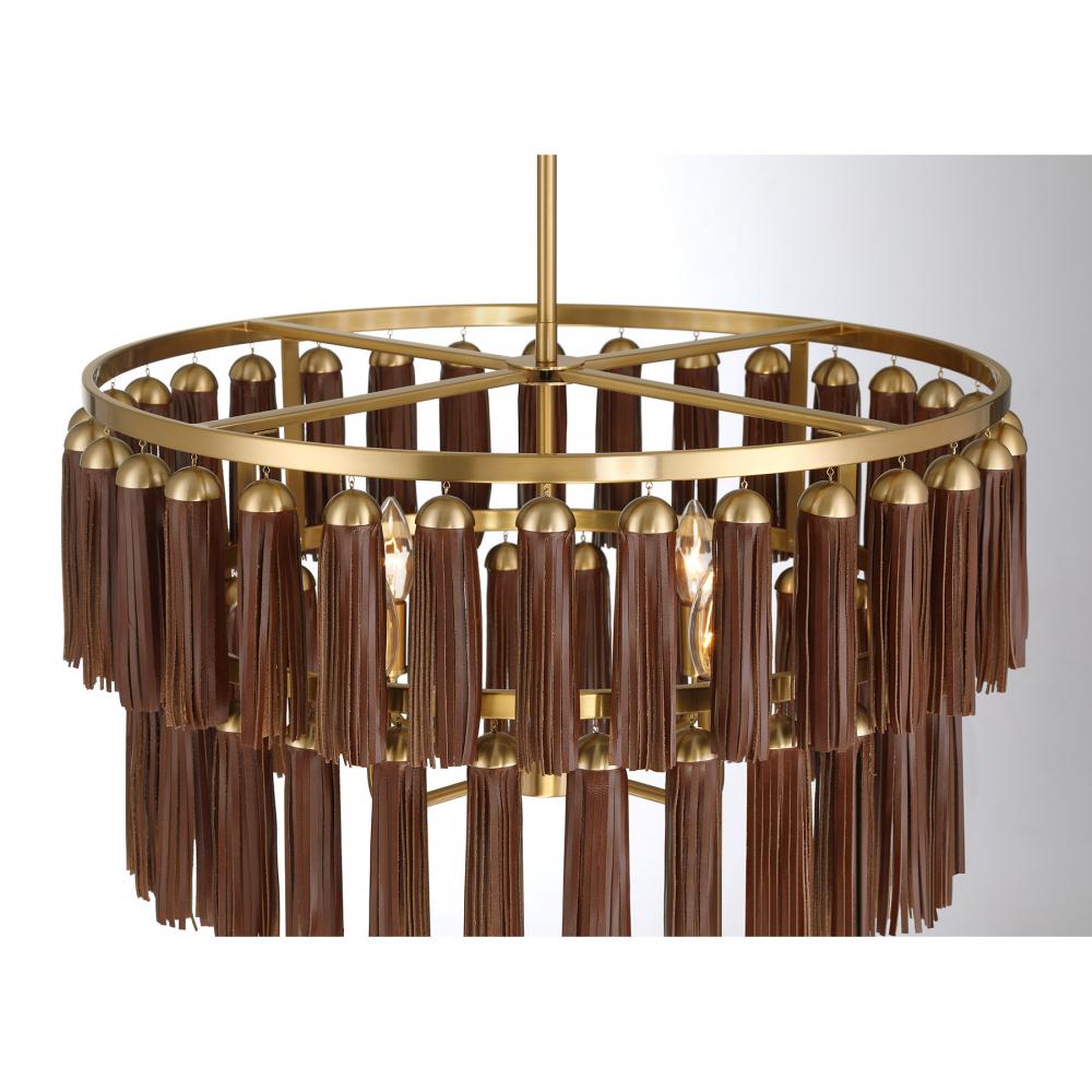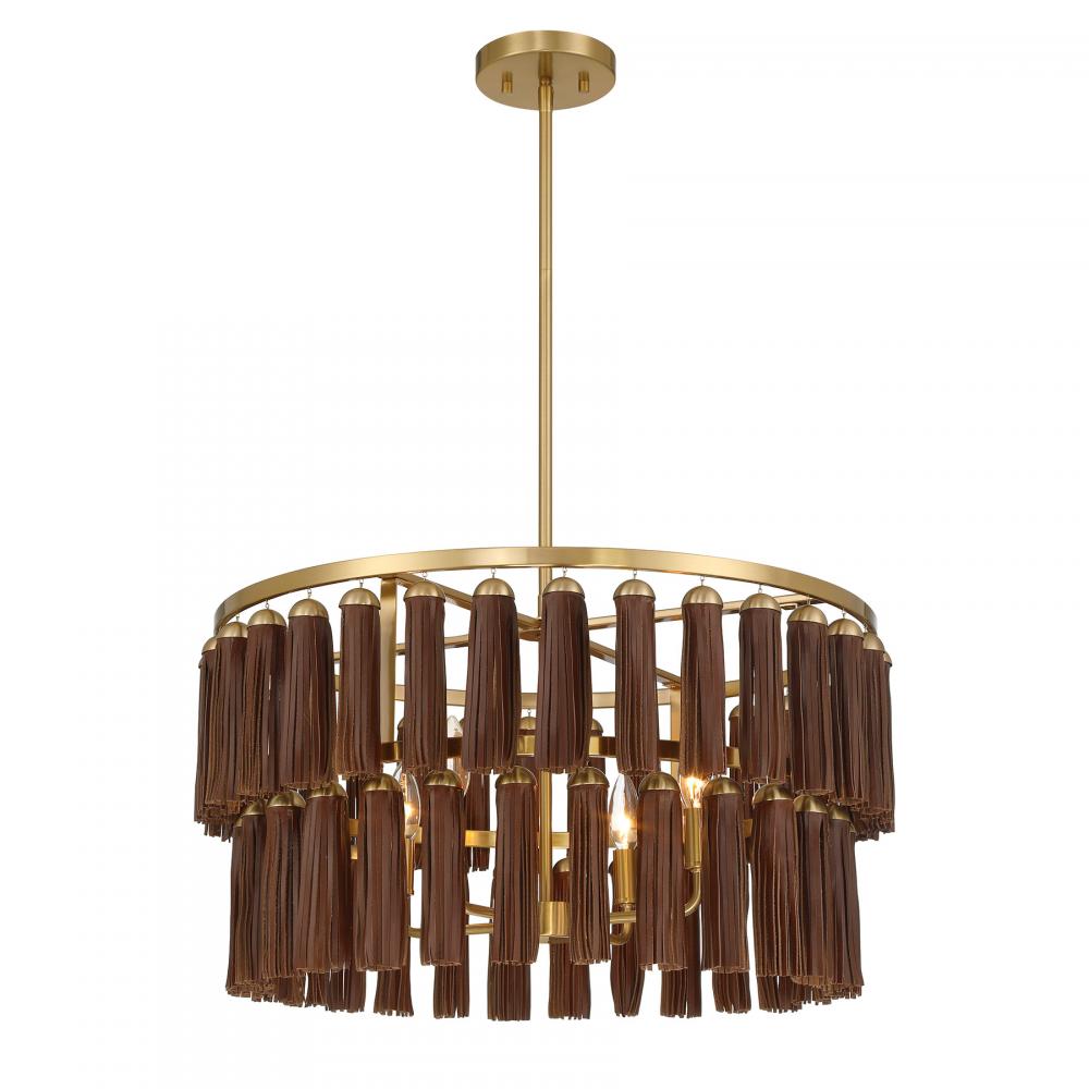 In the Savoy House Aquitane 4-light pendant, draping style is given a stately twist inspired by luxury handbags. Two tiers of natural leather tassels hang down from the circular frame, offering up a big dose of bold appeal and recalling the adornments on designer leather goods. The Warm Brass finish pairs up perfectly with the chestnut tone of the leather. Aquitane is 24" in width and has an adjustable height ranging from 14" to 68". Uses four candelabra size bulbs of up to 60 watts per bulb. Bulbs not included. Comes with four 12" downrods and one 6" downrod.