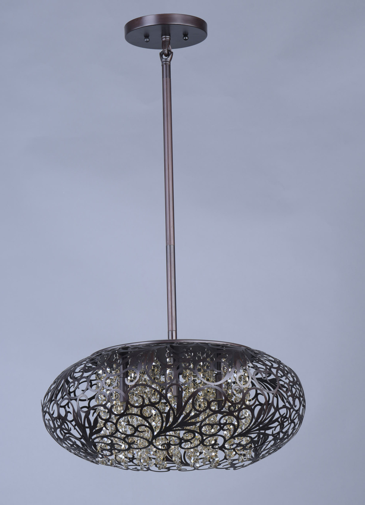 The Arabesque collection's intricate patterns are formed in metal and finished in Golden Silver. Strands of crystal beads add sparkle as they shimmer through the Xenon lamps.  Unique oval-shaped pendants add a touch of class to any room.