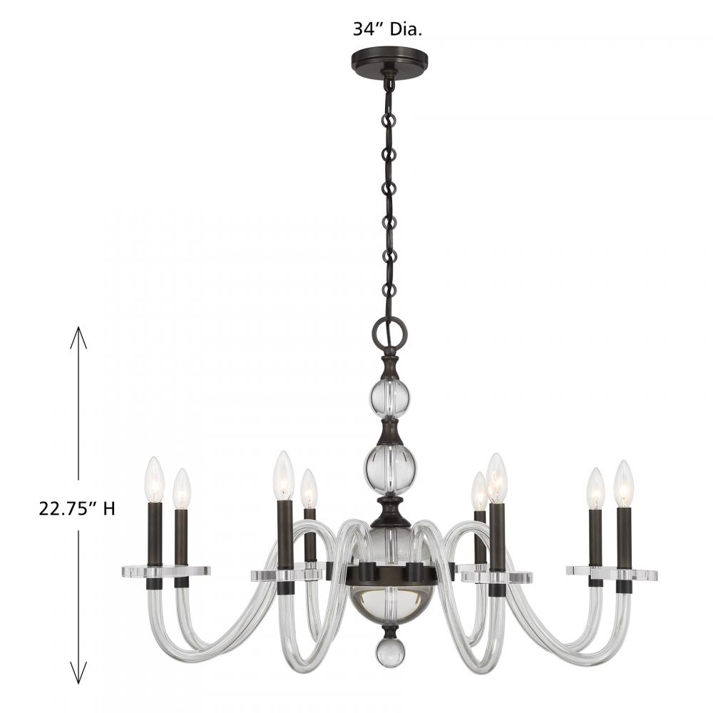 Bring the stately style of the Savoy House Aragon 8-light chandelier into your home and create a space fit for royalty! Its elegantly curving arms and parts of its center column are fashioned from clear glass, which modernizes a traditional silhouette, while the Mediterranean Bronze finish adds richness. Aragon is 22.75" in height and 34" in width. It uses eight candelabra size bulbs of up to 60 watts per bulb. Bulbs not included. Comes with 120" of chain.
