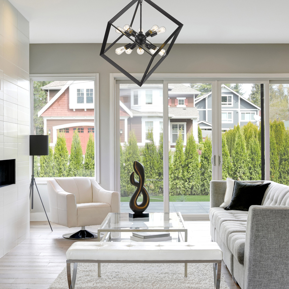 Architect is a contemporary series of dangling cubes that imitate the beauty of geometric jewelry. The gleaming open boxes feature exposed bulbs which sit centered for a captivating, clean industrial feel. Featuring medium base bulbs, these modern diamond cubes are sure to add sparkle to any interior. Ideal for a dining room or foyer, this 10-light pendant provides a glowing presence.