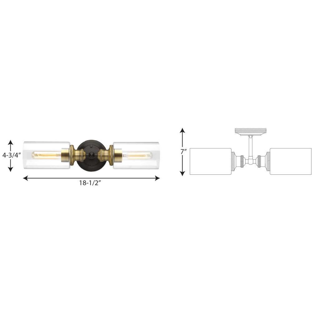 Ideal for a bathroom;Perfect for farmhouse, urban industrial, and vintage electric style settings;Handsome antique bronze finish with natural brass accents.;Crisp clear glass shades;Fixture can mount horizontal and vertical;Use 2 medium base bulbs that are