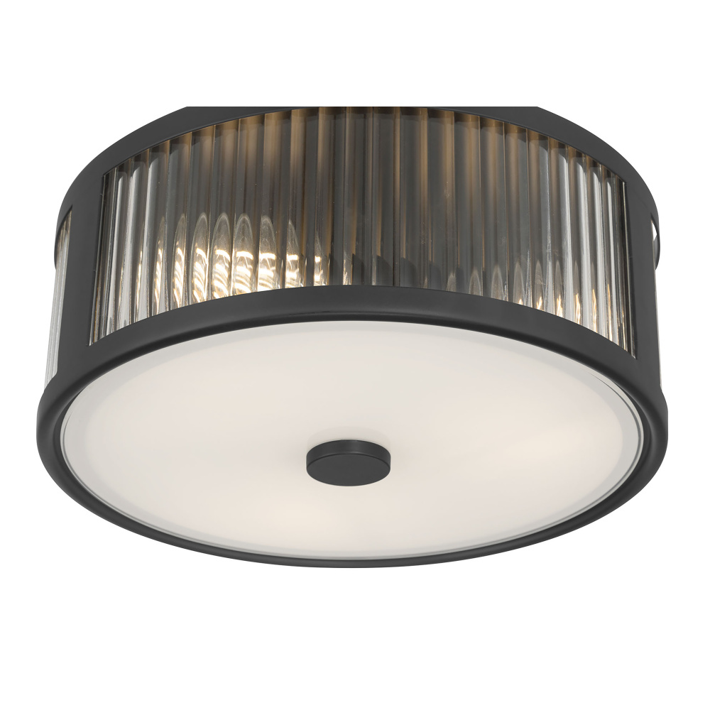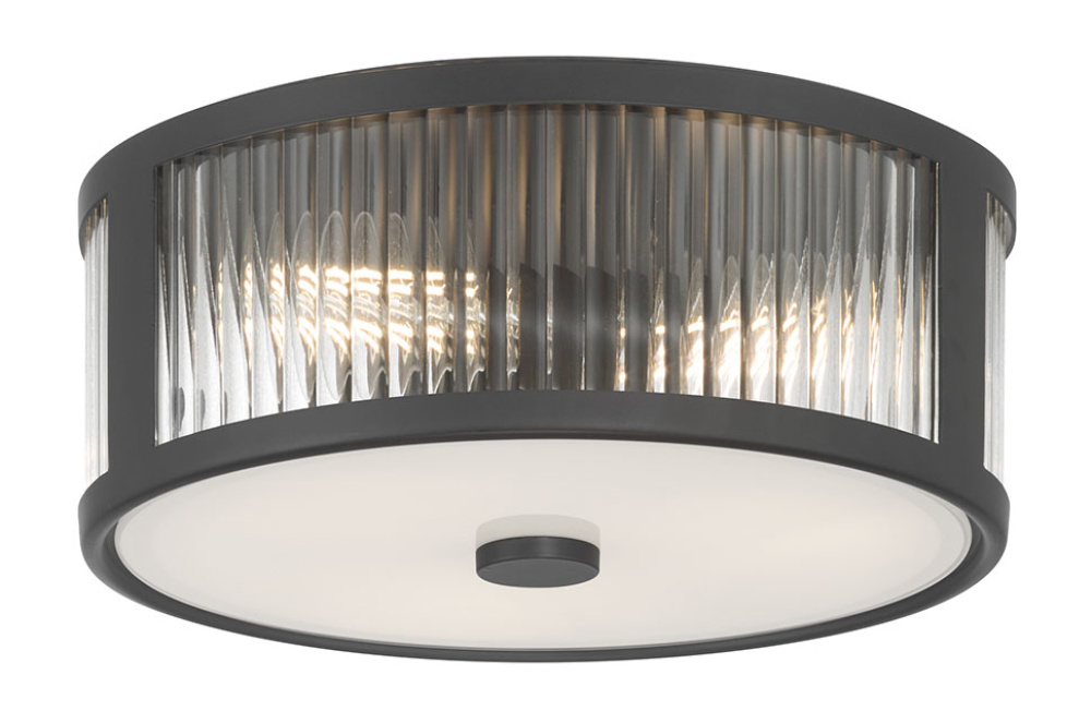 The Ardezia Collection of flush mount and semi-flush mount celling lighting takes on a distinctive flair with gorgeous clear ribbed glass shades creating a unique play of light. The steel, drum shaped fixtures are finished in either matte black, polished nickel or vintage brass and are the perfect complement to any interior from Mid-Century modern to modern transitional while the opaque off-white diffuser provides warm and inviting illumination.
