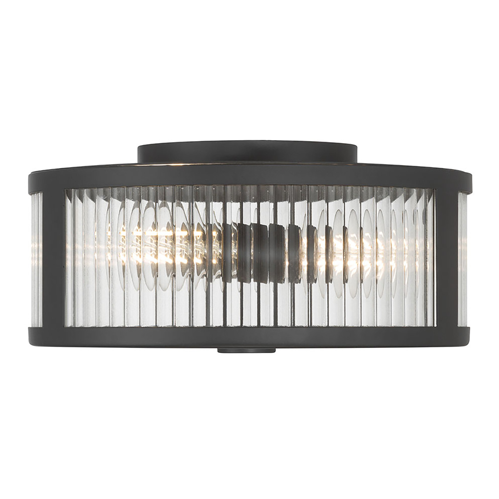 Featuring a Matte Black finish with a Clear Ribbed glass shade.