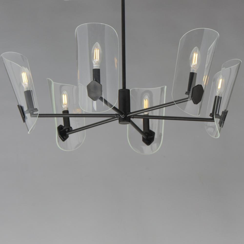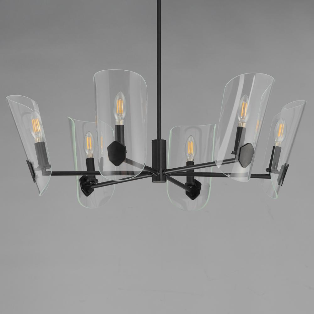 A Coat of Arms in curved Clear glass shades bevel cut and shaped to resemble traditional shields radiates off slender tubular arms. The streamlined design takes on a transitional approach with imaginative details that carries through to the concept for the