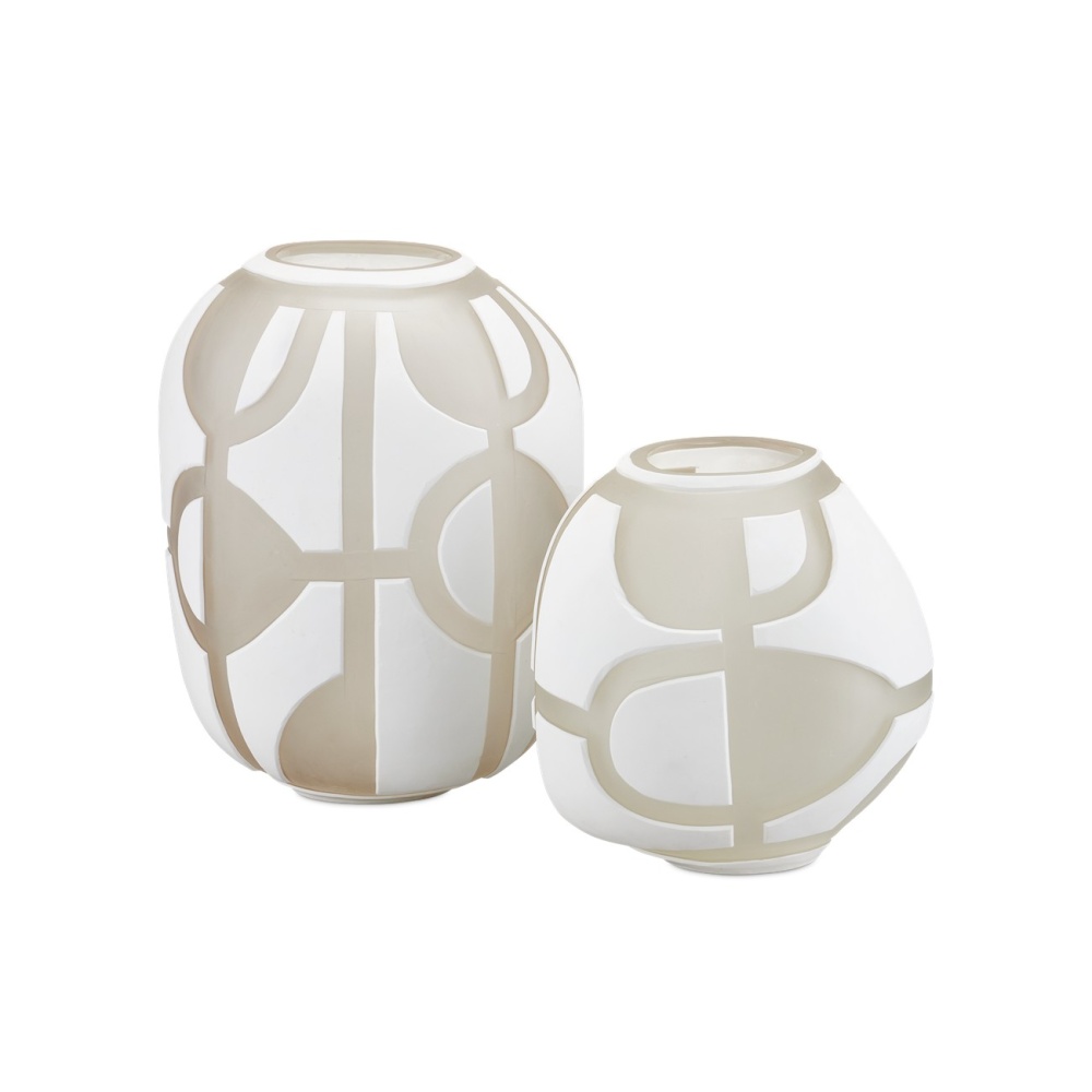 The Art Decortif White Vase Set was realized in the tradition of Venetian glass techniques. Two layers of glass, one white and one clear with a matte surface, are hand-cut so that portions of the white glass are removed to create the geometric pattern that is reminiscent of the era for which the vases are named. This is a complex process that makes these true artisanal pieces.