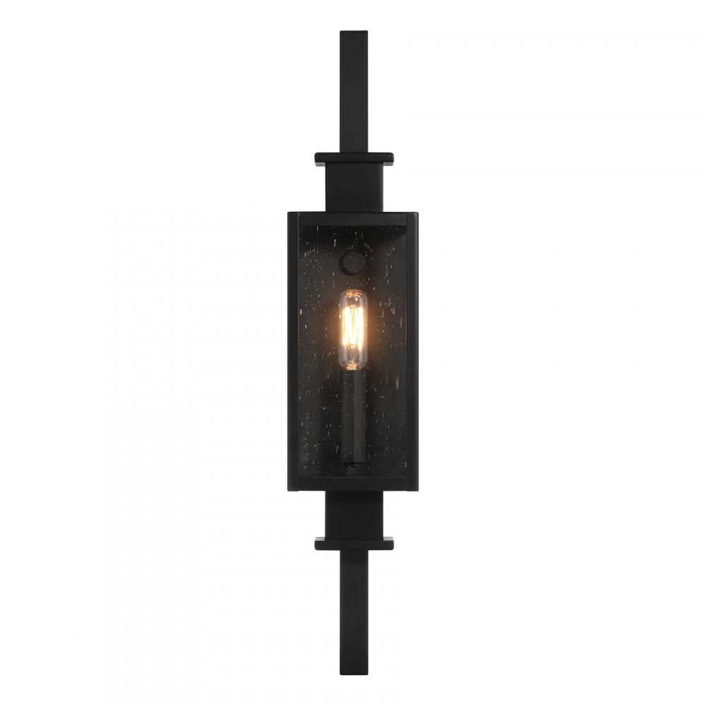 The Savoy House Ascott 1-light outdoor wall lantern is a standout source of cool contemporary lighting style for great first impressions. Sleek and slender, Ascott features a center-mounted light inside panes of clear seeded glass in a sharply angled frame. Matte Black finish. Ascott is 21.5" in height, 4.5" in width and extends 6.25" from the wall. Uses one candelabra size bulb of up to 60 watts. The bulb is not included. Wet area rated.