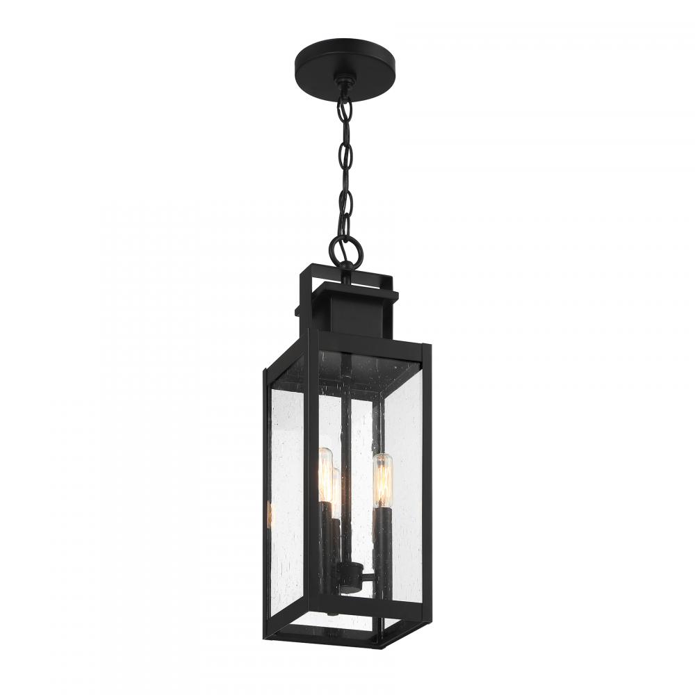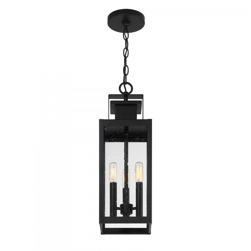 The Savoy House Ascott 3-light outdoor hanging lantern is a standout source of cool contemporary lighting style for great first impressions. Sleek and slender, Ascott features lights inside panes of clear seeded glass in a sharply angled frame. Matte Black finish. Ascott is 20" in height and 6.5" in width. Uses three candelabra size bulbs of up to 40 watts per bulb. Bulbs not included. Damp area rated.