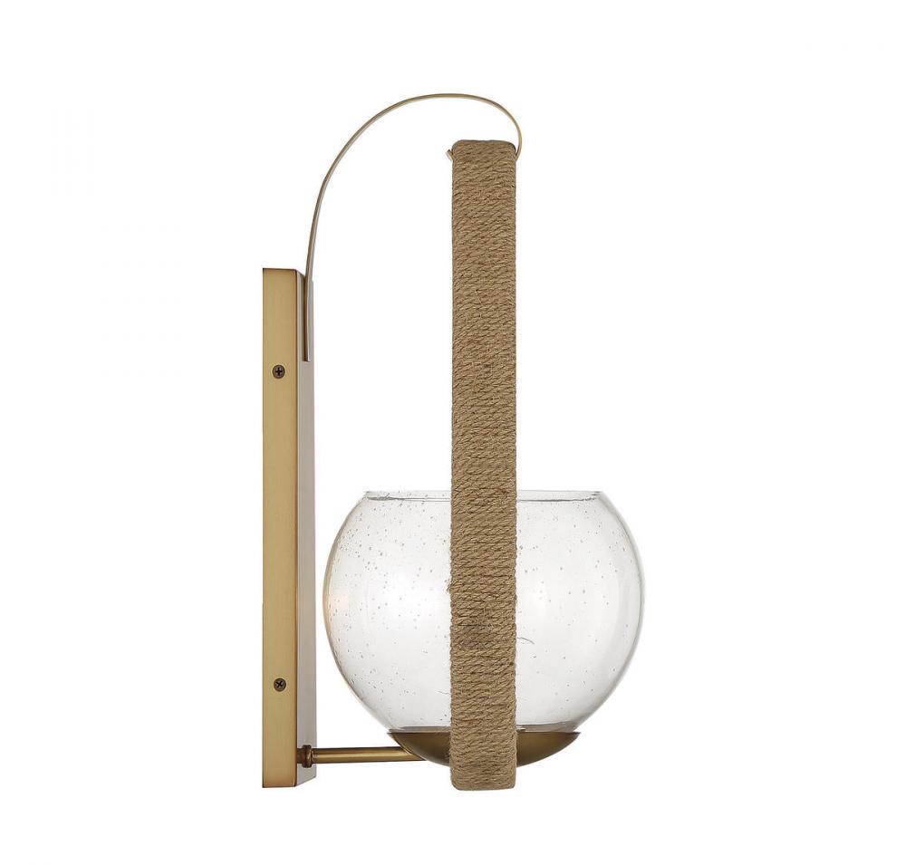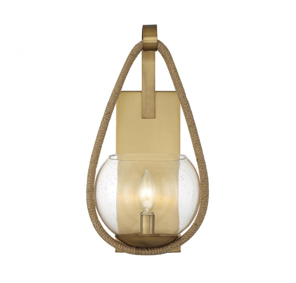 This Savoy House Ashe 1-light sconce has a warm, organic design. A band of textured rope ensconces a bubble-like shade of clear seeded glass, providing a stylish look even when the light is off. Finished in warm brass. Ashe is 16" in height, 8.5" in width and extends 8.5" from the wall. It uses one candelabra size bulb with a max of 60 watts. Damp area rated.