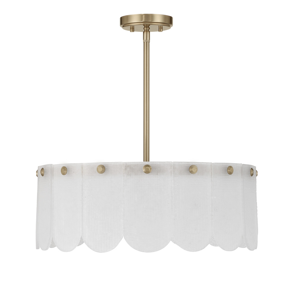 With its luminous Noble Brass finish and delicately textured frosted sugar glass petals, the Savoy House Ashton 4-light convertible pendant adds a warm, inviting radiance to any room. Use it as a pendant or as a semi-flush mount - its minimalist lines and soft glow make it stunning in either form. Ashton is 20" wide with an adjustable height ranging from 8" to 60". It uses four candelabra size bulbs of up to 60 watts each (bulbs not included). Includes four 12" downrods and one 6" downrod.