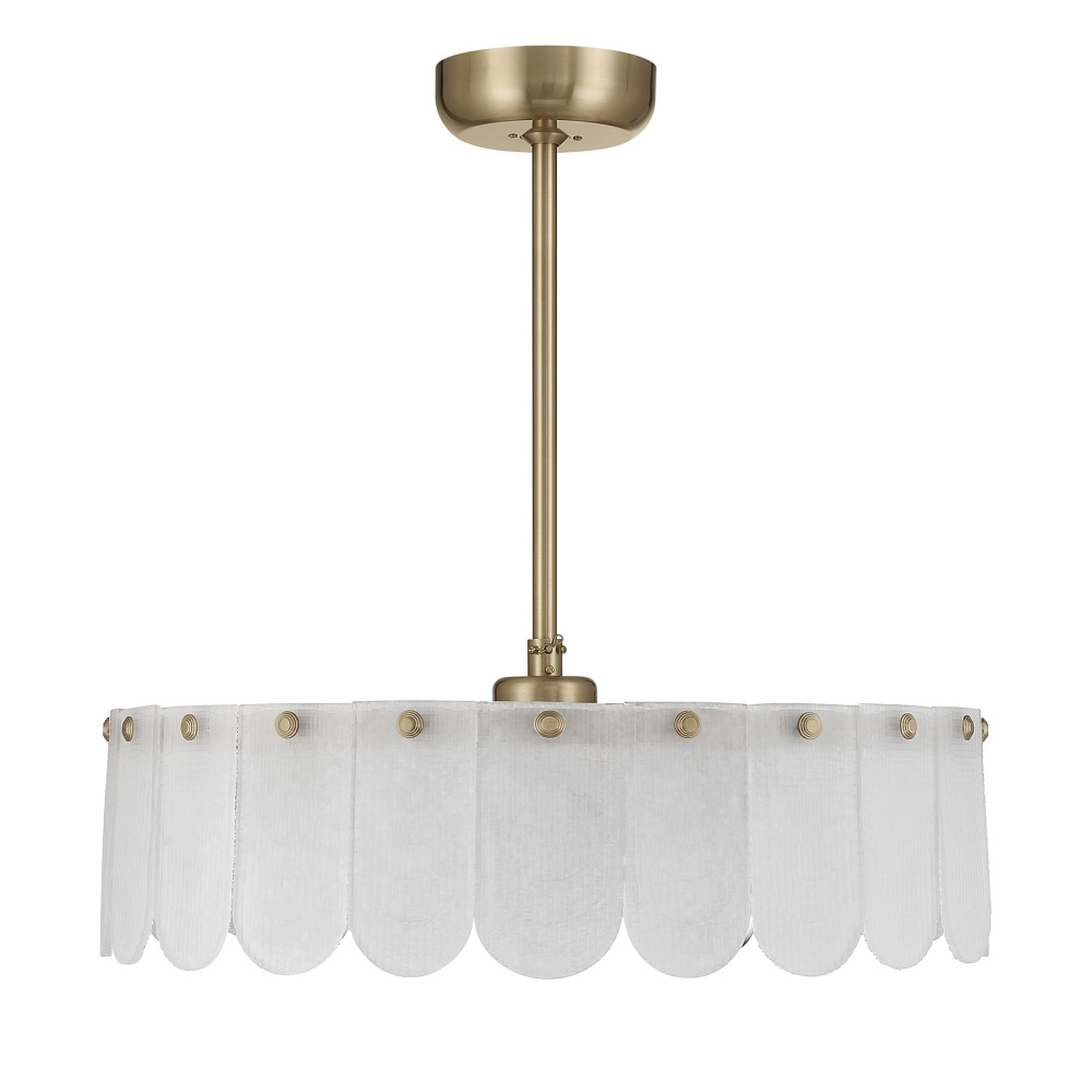 Soft, shimmering elegance takes center stage in the Savoy House Ashton 5-light Fan D’Lier. Frosted sugar glass petals glow beautifully against a bright Noble Brass finish, creating an uplifting, inviting presence. The built-in fan keeps air flowing gently, adding comfort alongside style. Ashton is 29" tall and 28" wide. It uses five standard size LED bulbs (included) and comes with a handheld remote. Includes a 4" downrod and an 18" downrod. Fan D’Liers are a Savoy House exclusive that reimagines cooling and lighting in one fashionable form.
