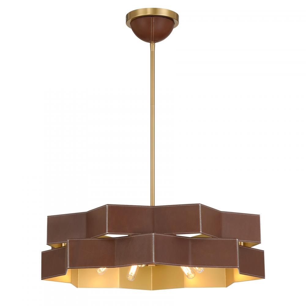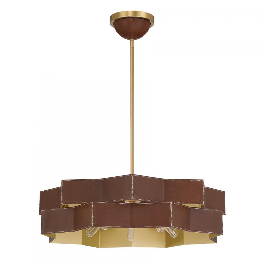 Discover the stunning starburst style of the Savoy House Atherton 8-light chandelier, a bright and stately design that is decorated with natural leather to add richness and texture. You can even see evidence of the careful craftsmanship in the detailed stitching throughout! The Warm Brass finish pairs up perfectly with the chestnut tone of the leather. Atherton is 24" in width and has an adjustable height ranging from 6" to 60". Uses five candelabra size bulbs of up to 60 watts per bulb. Bulbs not included. Comes with four 12" downrods and one 6" downrod.