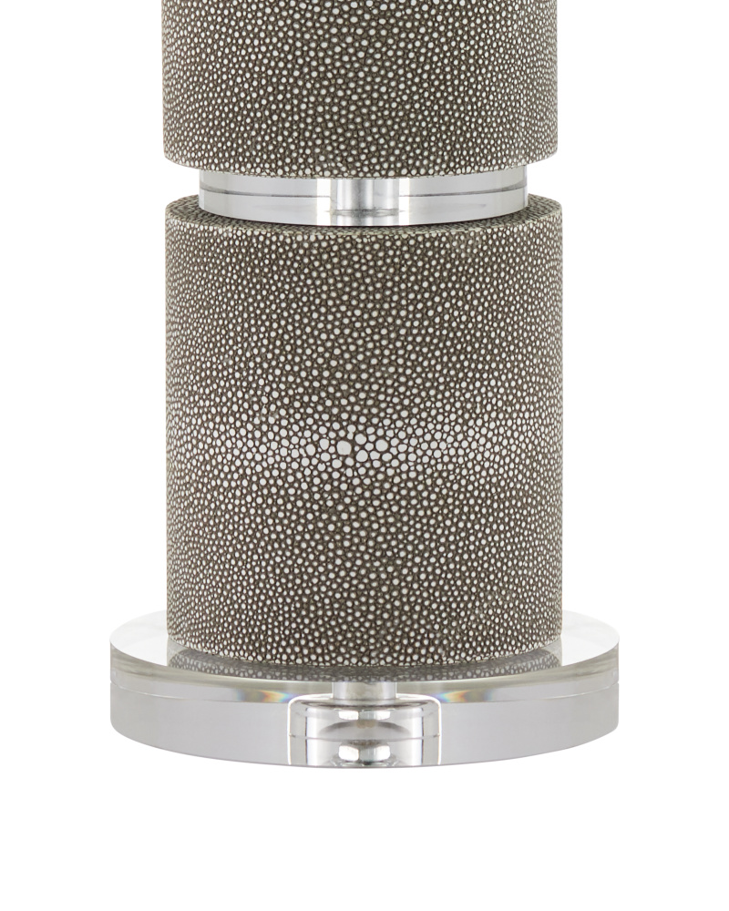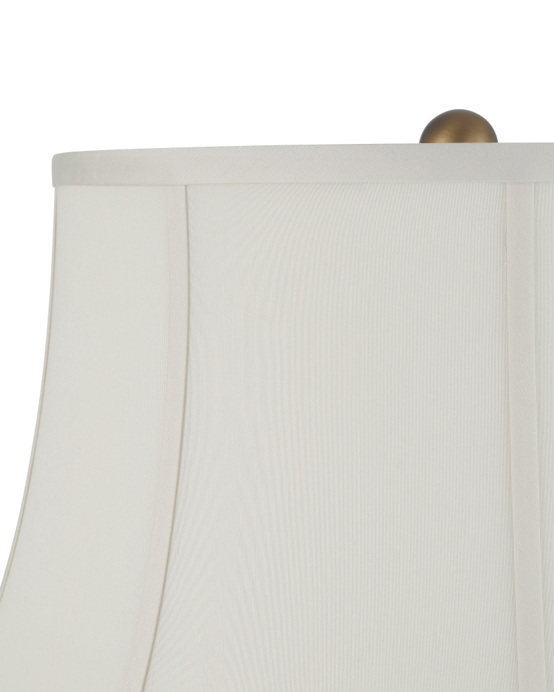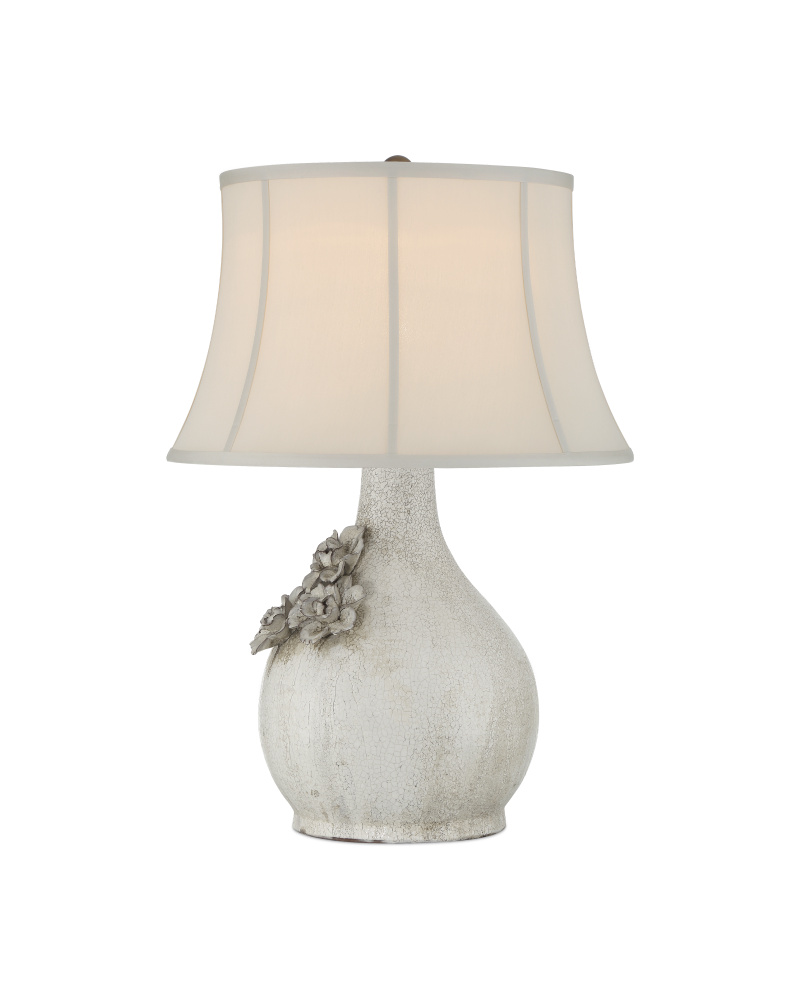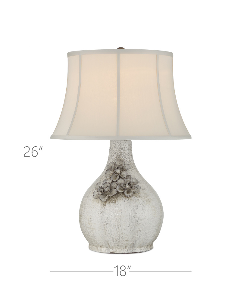 The Attar White Table Lamp is made of ceramic with a crackling, falling glaze that will be slightly different from lamp to lamp. This is a complex treatment involving the application of a glaze that contracts at a different rate than the clay body during firing. As the glaze cools, a network of fine lines, or crazing, results. The textured, aged appearance is especially pronounced on the trio of hand-formed flowers that are applied to the lamp’s body. The soft-backed bell-shaped shade enhances the vintage feel.