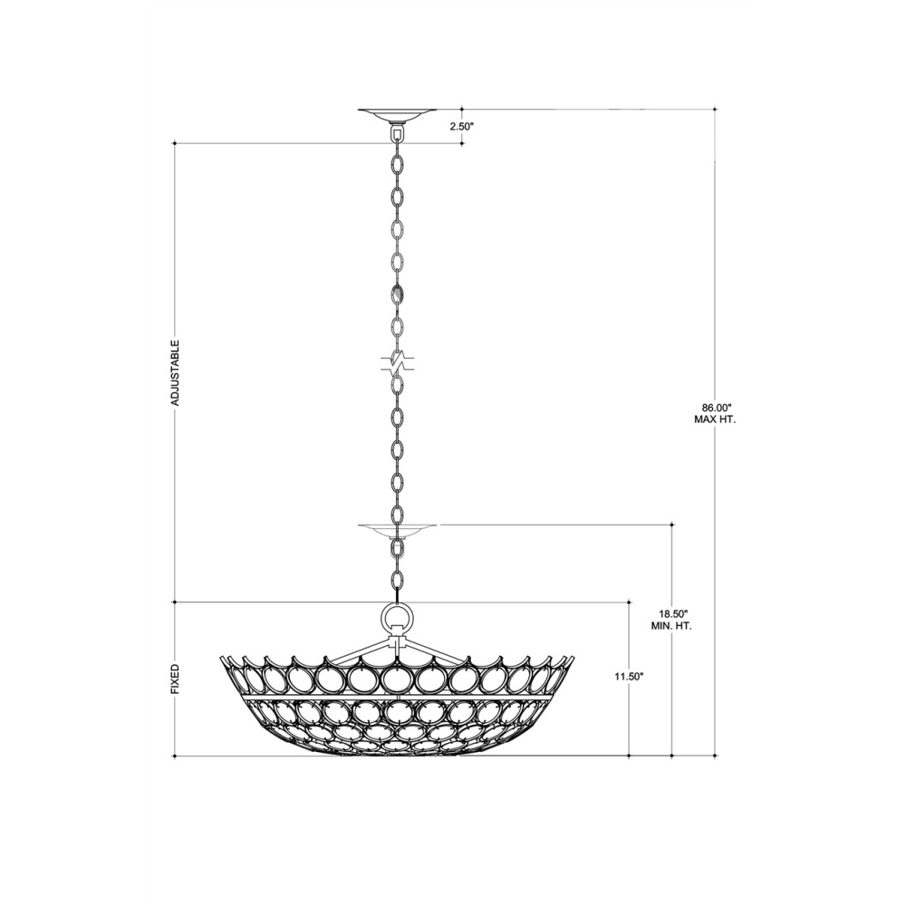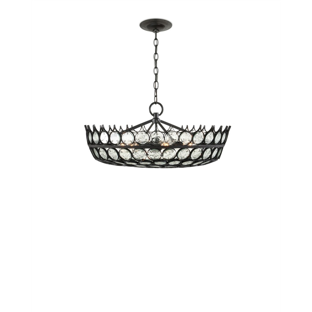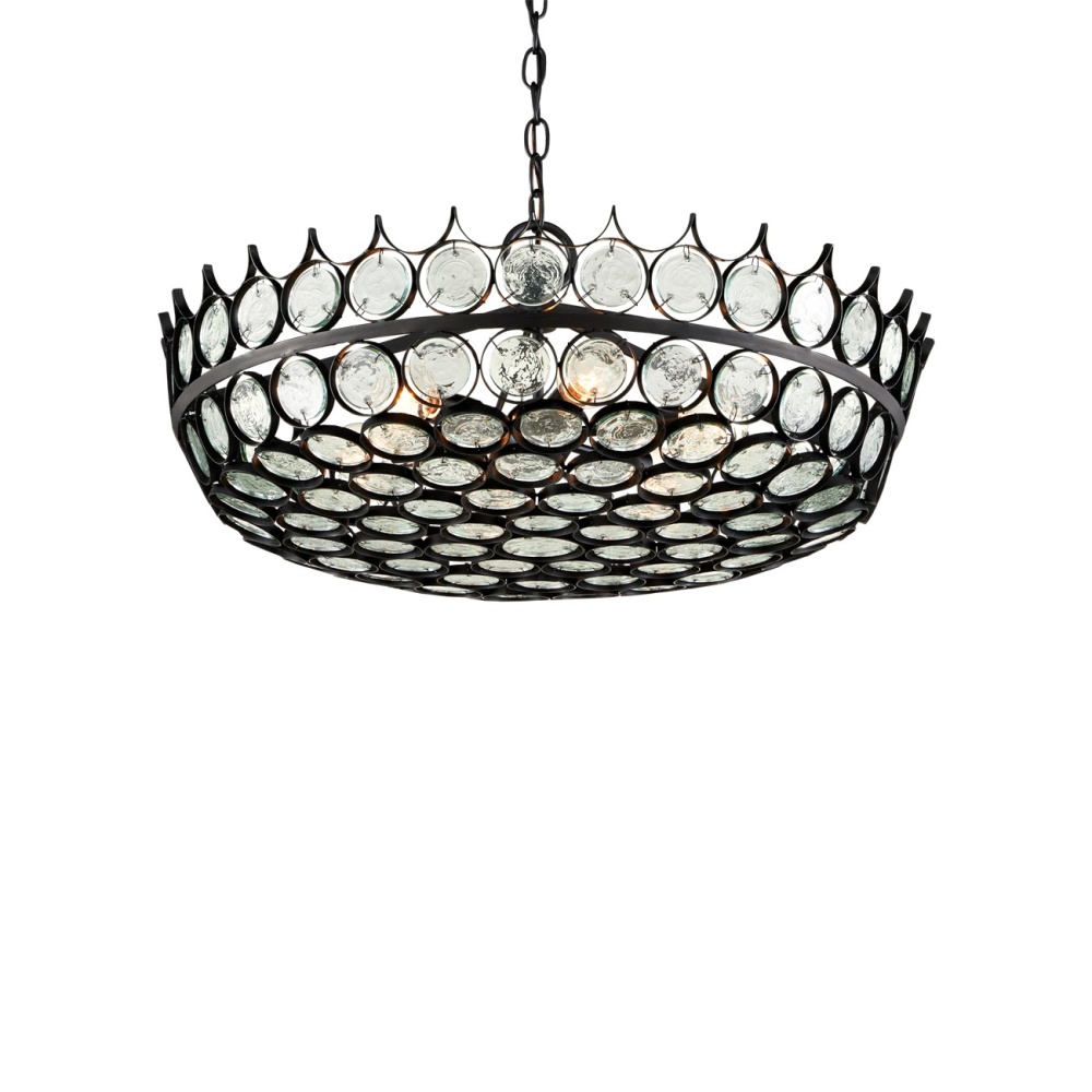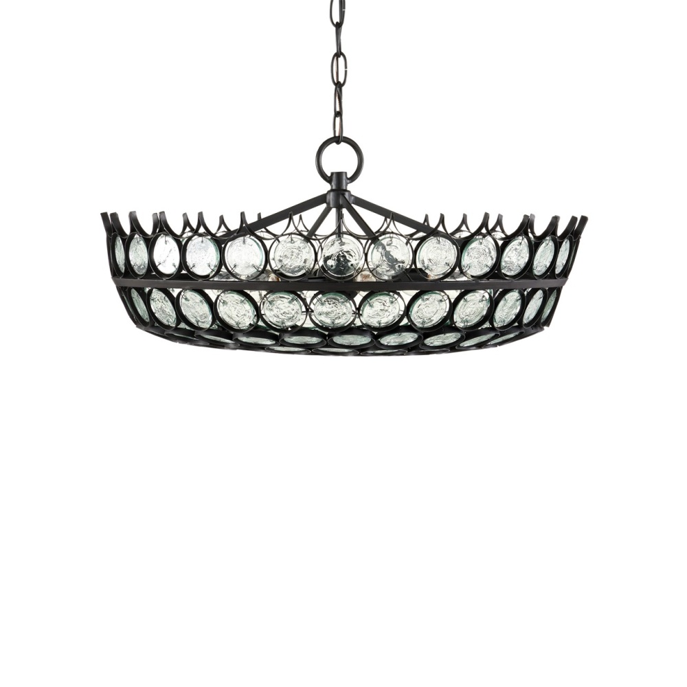 Recycled glass discs are encased in wrought iron in a satin black finish to bring the Augustus Small Chandelier great aesthetic strength. Design details of note are how unobtrusively the discs are fastened to the frame and the fact that the discs grow smaller as they descend to the bottom of the shade. This classic black chandelier is in the Bunny Williams Collection. Adjustable from 18.5" to 86" with use of included chain/rod kit/cable. If your space calls for a longer drop, additional chain/rods/cable is available for purchase.