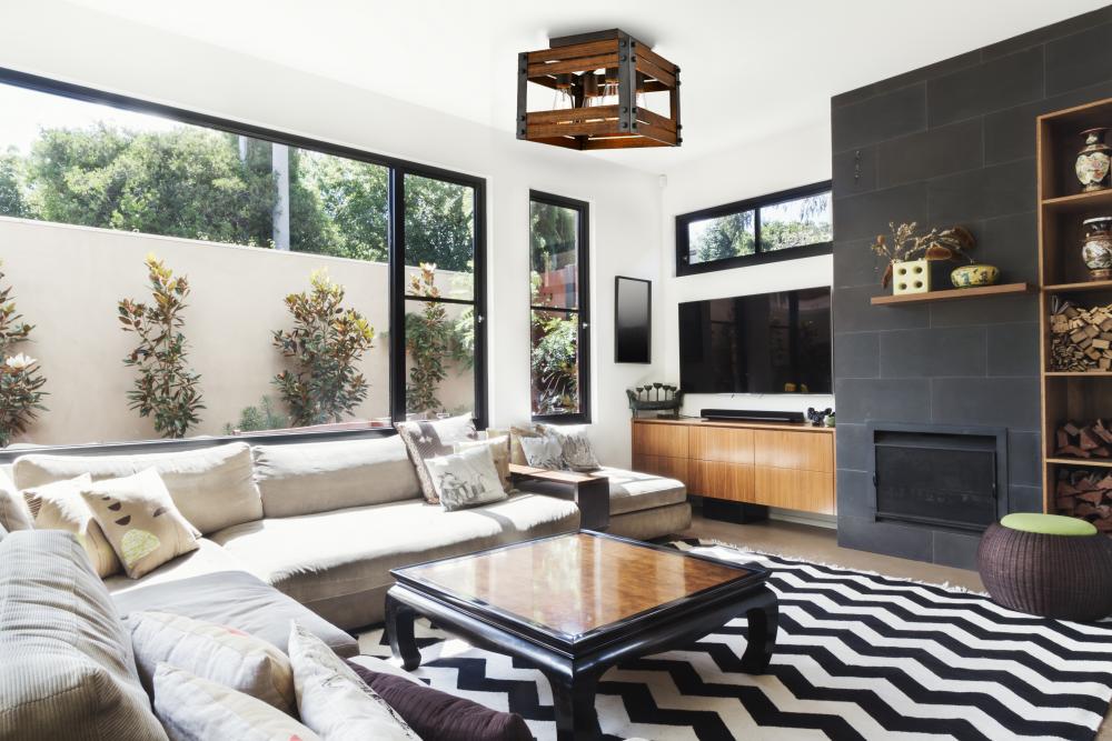 Farmhouse design accented with bolted metal and distressed wooden slats.