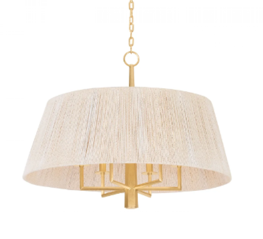 French Riviera finesse meets mid-century modernism in the Azar pendant. The large drum shade is wrapped entirely in Bleached Abaca cord, allowing light to shine through. Finished in Vintage Gold Leaf, the angular frame takes its cues from vintage iron lighting as it peaks out from under the shade. Available in two sizes with either 4 or 6 lights, Azar provides a sophisticated lighting experience.