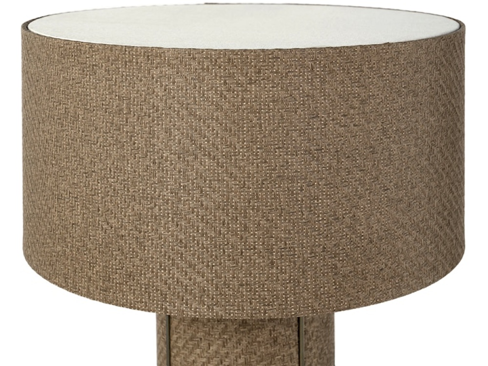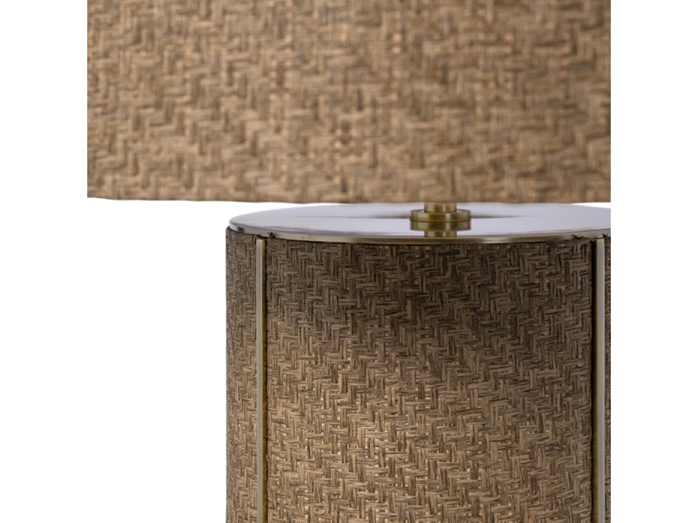 Hand-woven grasscloth in a warm brown two-tone finish, placed over a hardwood body and shade, accented with an antique brass finished metal base, cap, and details