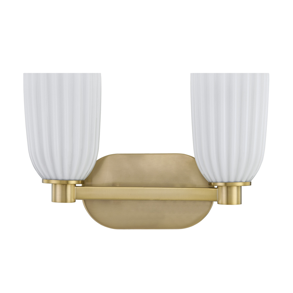 The Savoy House Baldwin 2-light bath vanity light brings a clean, sculptural presence to your space. A streamlined bar finished in Noble Brass supports a pair of ribbed opal glass shades that soften the light and add beautiful dimension. Baldwin is 9.13" in height, 14" in width and extends 5.5" from the wall. It uses two standard size bulbs of up to 60 watts per bulb. Bulbs not included. Damp area rated and can be installed horizontally or vertically.