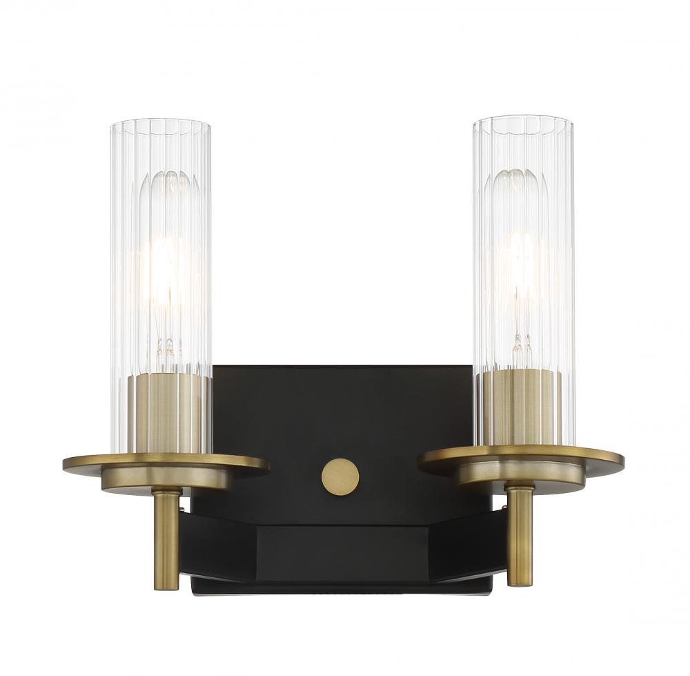 2 Light Bath in Coal and Soft Brass Finish with Clear Ribbed Glass