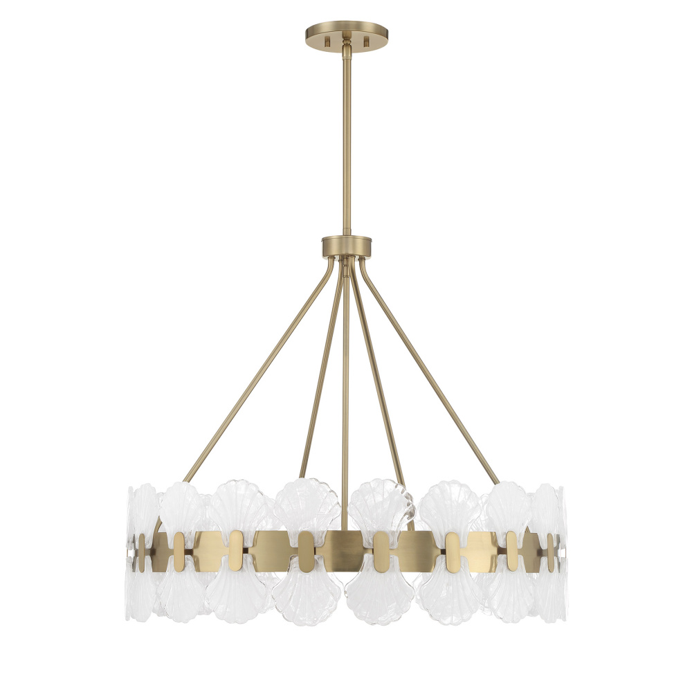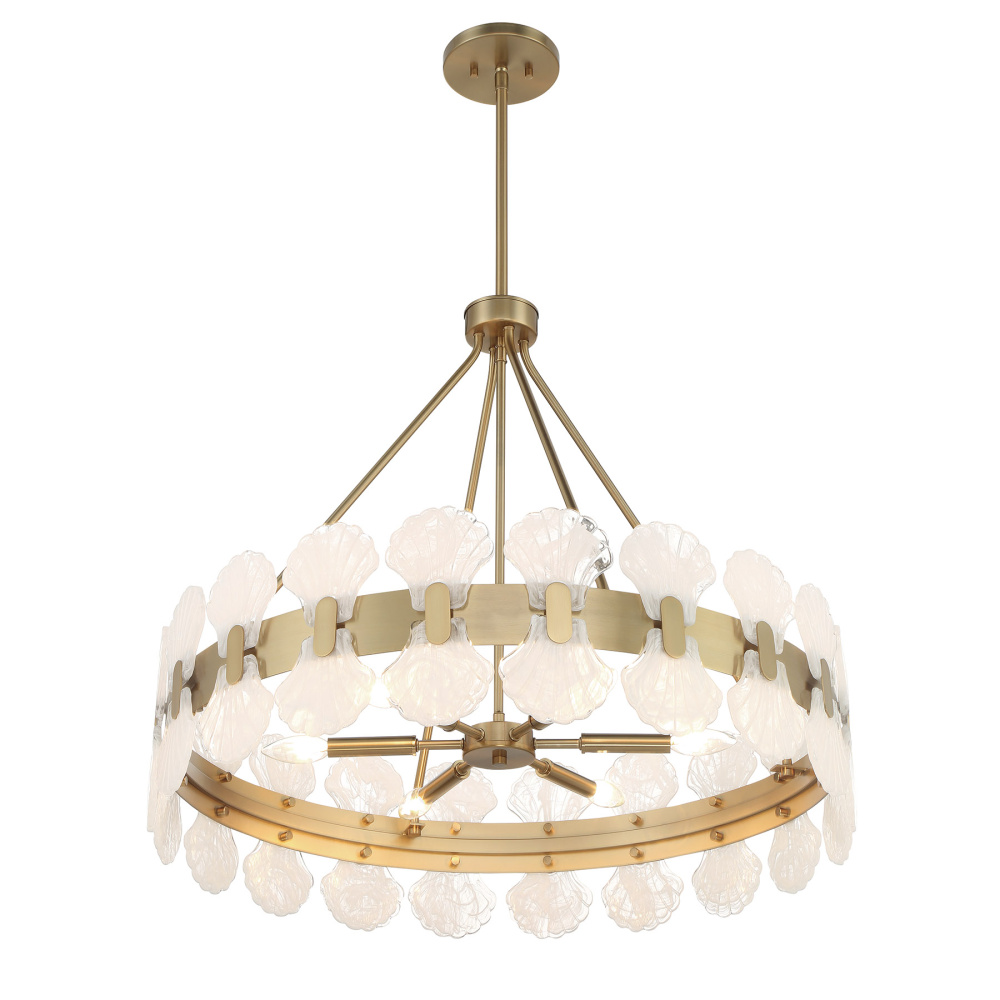 In the Bancroft 6-light chandelier from Savoy House, coastal charm is given a stylish upgrade! Its design is finished in fabulous Noble Brass and decorated with shell shapes crafted from mesmerizing strie glass. Bancroft is 27.375" in height and 30" in width. It uses six candelabra size bulbs of up to 60 watts per bulb. Bulbs not included. Comes with four 12" downrods and one 6" downrod.
