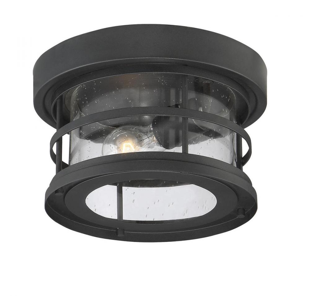 Light your outdoor spaces in retro-industrial style with the Savoy House Barrett 1-light flush mount. It has a sturdy, almost nautical aesthetic that looks great with many different architectural and decor styles. A round frame protects the glass shade and sports a streamlined grid design with a black finish. The seeded glass shade has terrific texture and allows ample illumination from the 60W standard size bulb. Measuring 10" wide and 6" high, this ceiling light works well alone or in groupings. Wet location rated, so it’s an ideal fixture to bring light and timeless style to your porch, patio, sunroom, pergola and other outdoor living areas.