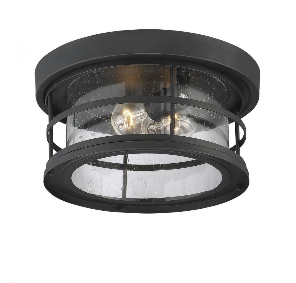 Light your outdoor spaces in retro-industrial style with the Savoy House Barrett 2-light flush mount. It has a sturdy, almost nautical aesthetic that looks great with many different architectural and decor styles. A round frame protects the glass shade and sports a streamlined grid design with a black finish. The seeded glass shade has terrific texture and allows ample illumination from the 60W standard size bulbs. Measuring 13" wide and 6.75" high, this ceiling light works well alone or in groupings. Wet location rated, so it’s an ideal fixture to bring light and timeless style to your porch, patio, sunroom, pergola and other outdoor living areas.