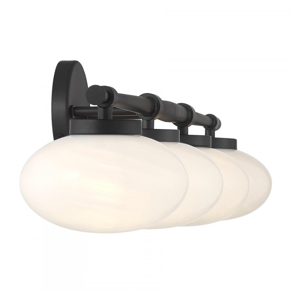 Add a hint of midcentury modern style to your bath with the Savoy House Barrow 4-light bath light. Oval-shaped shades of swirling, stunning strie glass hang down from stylized arms that are, like the round backplate, finished in Black. Barrow is 8" in height, 33.75" in width and extends 8" from the wall. It uses four G9 bulbs of up to 60 watts per bulb. Bulbs not included. Install as shown. This bath bar is damp area rated.