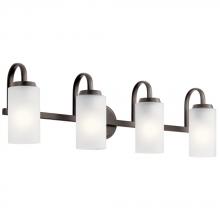 The Kennewick 2 light vanity light features beautiful Etched Glass shades that can face up or down, depending on your preference. It's Olde Bronze® finish complements your bathroom fixtures. With clean curves and smooth lines, this light's simplicity is refreshing.