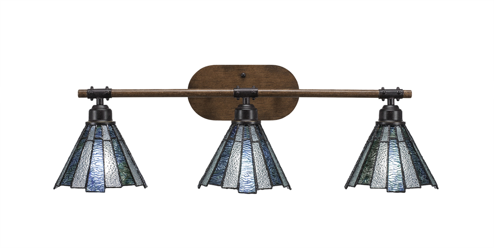 Toltec Lighting 1753-9325 Blacksmith 3 Light Bath Bar Shown In Painted Wood-look Metal & Dark Granite Finish With 7 Sea Ice Art Glass