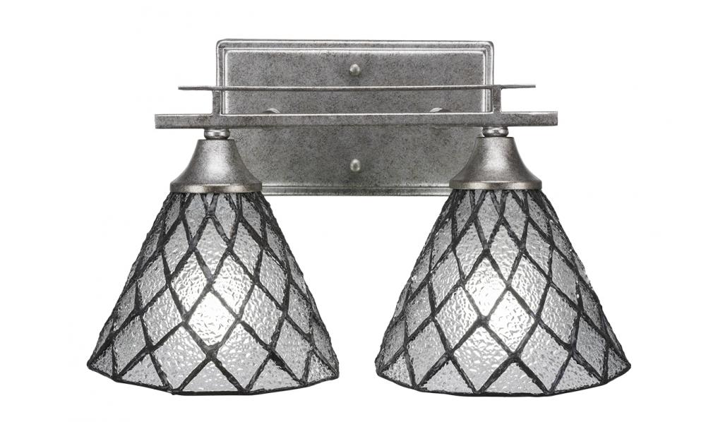 Toltec Lighting 132-AS-9185 Uptowne 2 Light Bath Bar Shown In Aged Silver Finish With 7 Diamond Ice Art Glass
