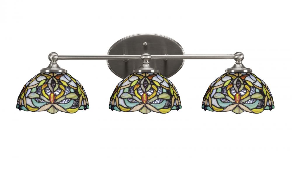 Capri 3 Light Bath Bar Shown In Brushed Nickel Finish With 7 Kaleidoscope Art Glass