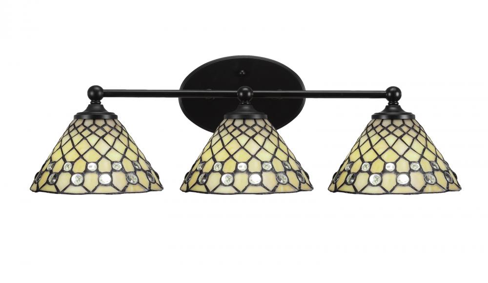 Capri 3 Light Bath Bar Shown In Matte Black Finish With 7 Starlight Art Glass