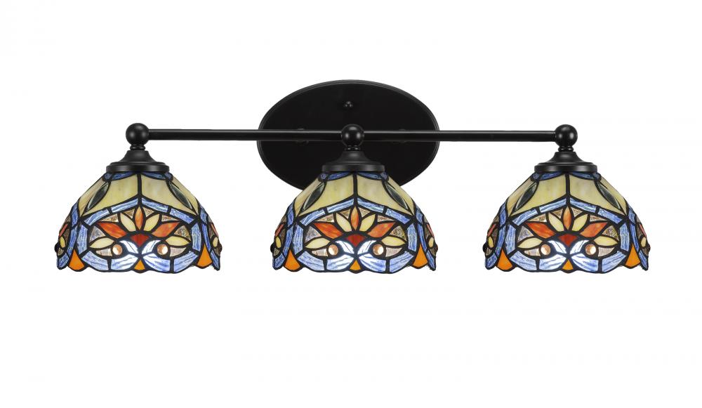 Capri 3 Light Bath Bar Shown In Matte Black Finish With 7 Pavo Art Glass