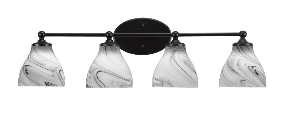 Capri 4 Light Bath Bar Shown In Matte Black Finish With 6.25 Onyx Swirl Glass
