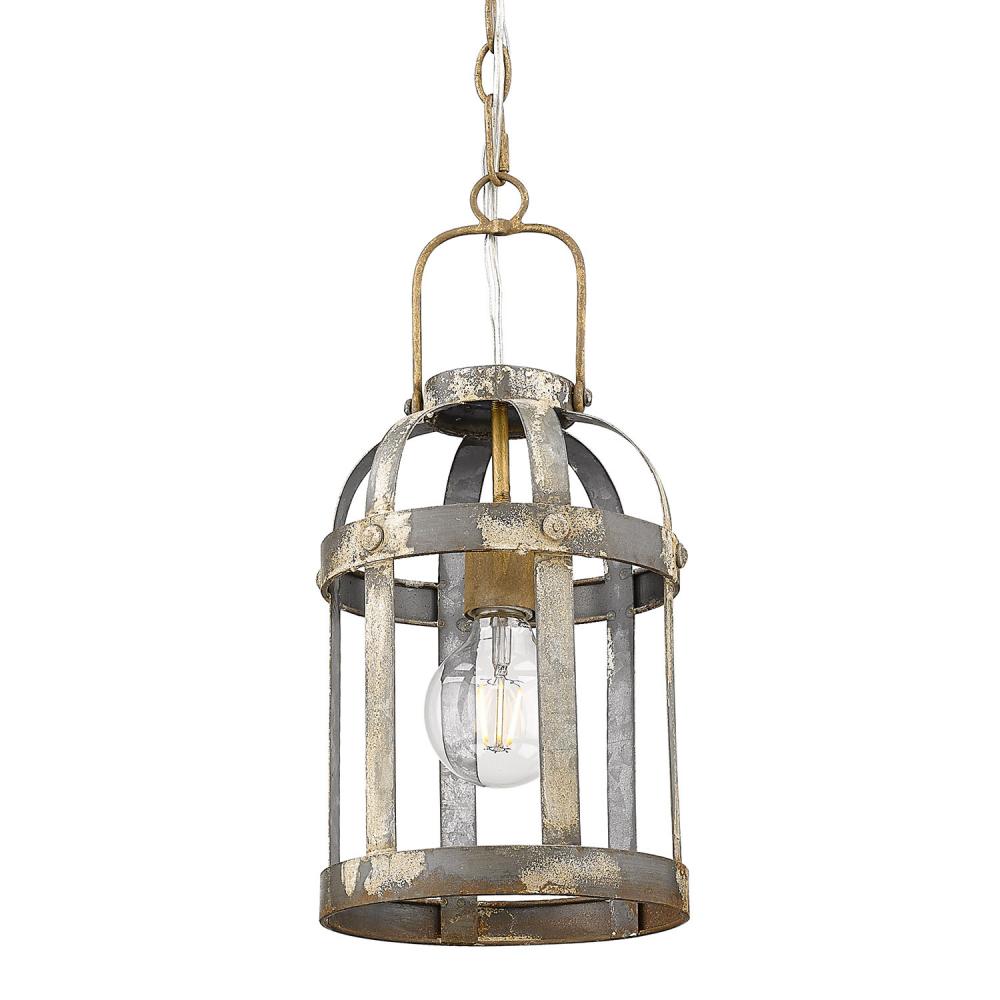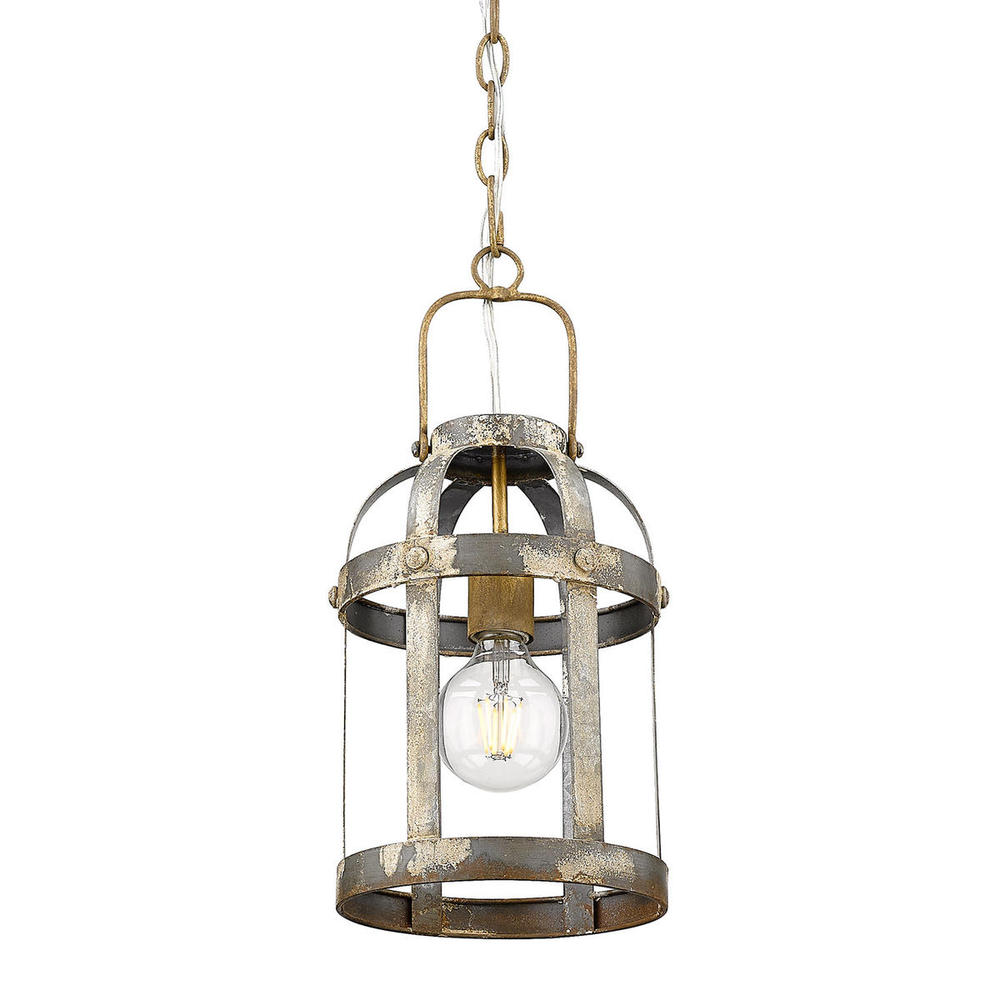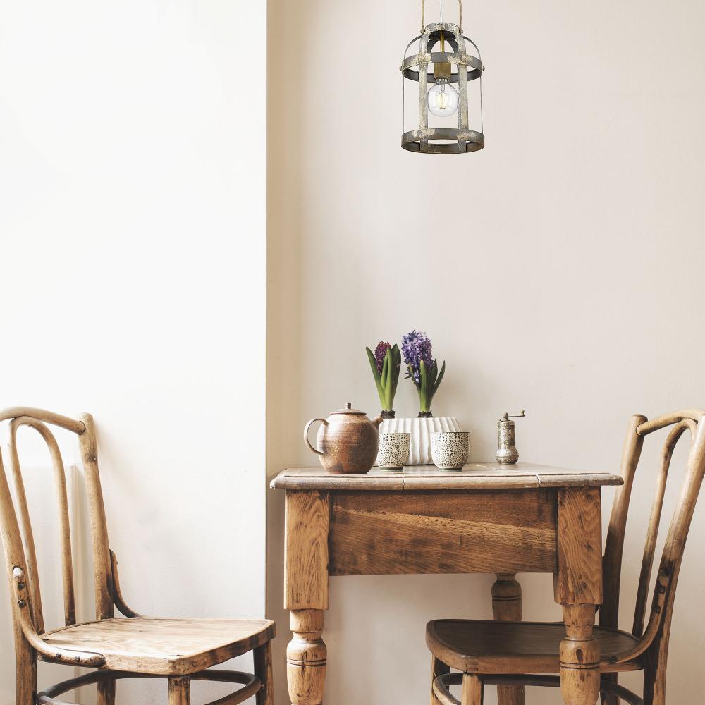 This eye-catching fixture is a transitional blend of industrial style and modern trends. Perfect for farmhouse decor, the rust-colored canopy and sockets complement the distressed open-cage. Find hints of cream, white, rust, and steel in the weathered Colonial Steel finish. The fixture is damp rated and may be hung in any indoor application. Mount the pendant as a single accent or install as a group.