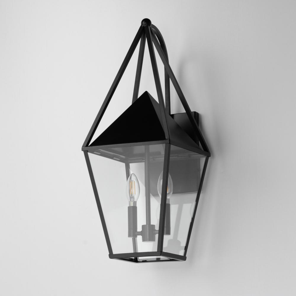 An exaggerated openwork framed steeple adds vertical qualities on a sharp-lined Matte Black lantern frame. Blending modern concepts with forms that evoke a whimsical imagery, this collection presents a transitional styling for outdoor spaces.