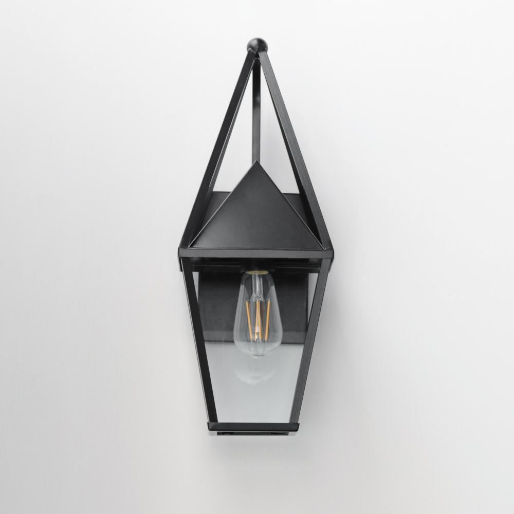 An exaggerated openwork framed steeple adds vertical qualities on a sharp-lined Matte Black lantern frame. Blending modern concepts with forms that evoke a whimsical imagery, this collection presents a transitional styling for outdoor spaces.