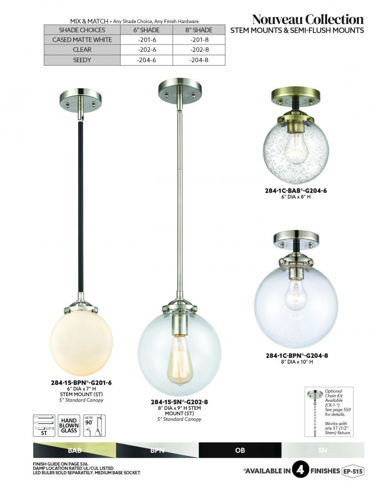 The Nouveau collection is comprised of heavy cast components with engraved lines that give the fixture an art deco look and feel. We offer the fixture in 4 finishes with over 100 possible metal and glass shade options that can change the style to fit any d