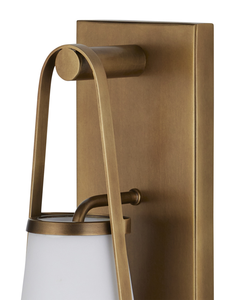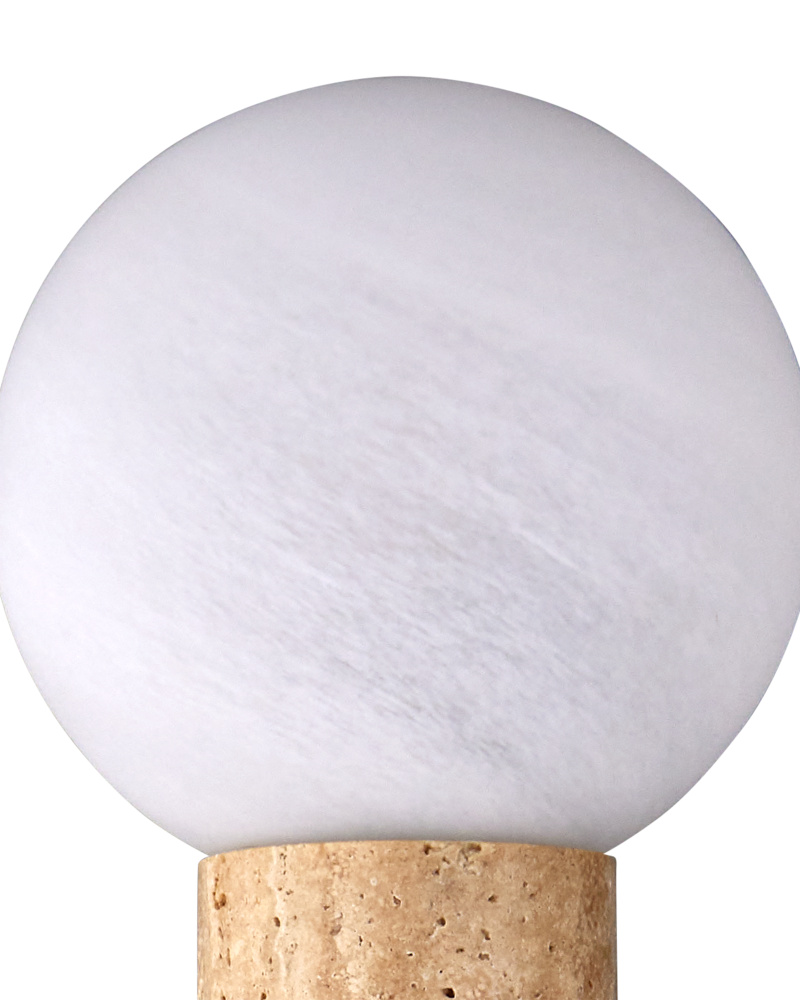 The Beatrix Beige Bath Wall Sconce features a center column made of natural travertine that extends beyond each end of the wall-plate to hold globes made of textured art glass. The milky, mottled glass draws out the pale veins in the travertine, while the antique brass finish on the metal brings warmth to the fixture. This wall sconce can be mounted horizontally or vertically, and the natural stone will vary from fixture to fixture.