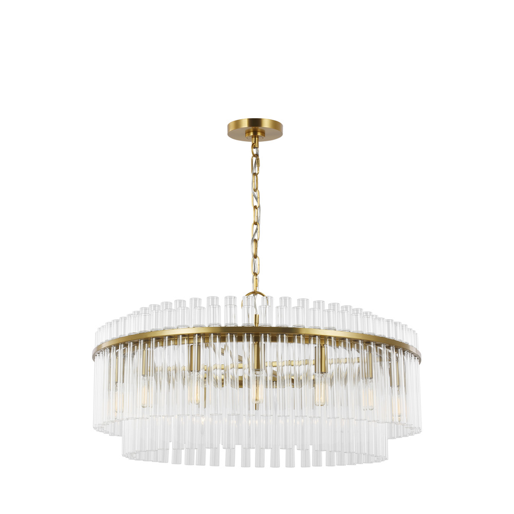 The Beckett family from Chapman & Myers presents Art Deco forms with a modern minimalist sensibility. Crafted of steel, a round metal band holds the clear extruded glass cylinders in place. The Beckett twelve light single-tier chandelier in burnished brass is the perfect way to achieve your home's desired fashion or functional needs.