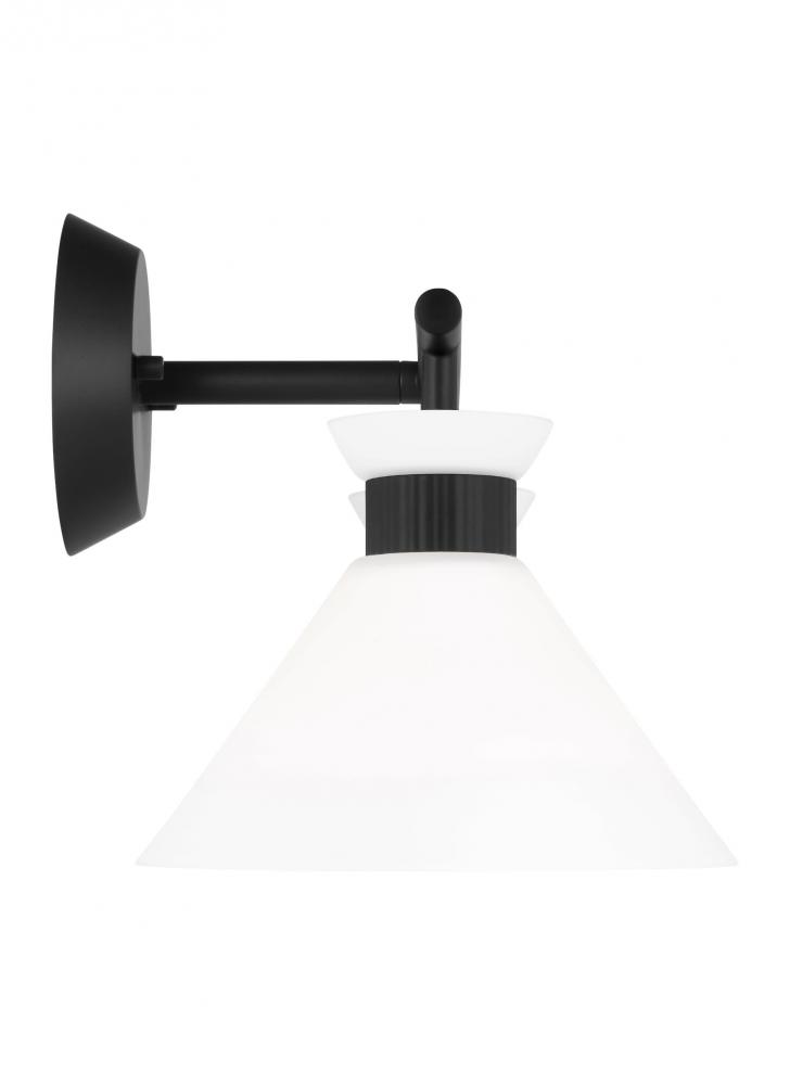 The flared glass shade with ribbed metal details and etched white glass of this light bring clean lines and classic mid-century modern design to any wall or bath space