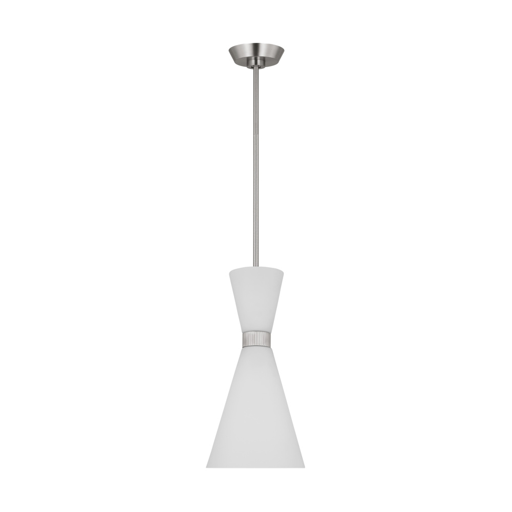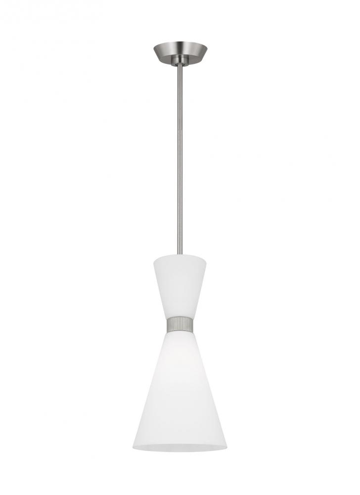Inspired by playful mid-century modern design, the Drew & Jonathan Belcarra Small Pendant is accentuated by a flared glass shade with ribbed metal details and etched white glass that bestows an almost whimsical touch to the clean design. Available in three finishes, Brushed Steel, Midnight Black, and Satin Brass, the Belcarra looks great on its own or when grouped in multiples. This product may be mounted on a sloped ceiling and is cETL listed for damp locations, making it the perfect lighting solution for any space.