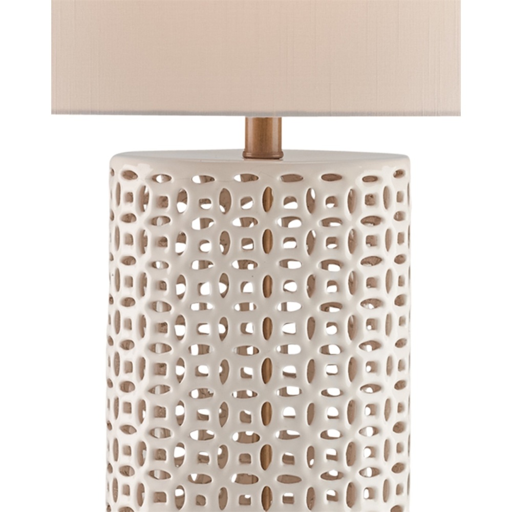 The Bellemeade Table Lamp has a pierced ceramic fretwork made from pale cream-colored ceramic, which contrasts the antique brass finish on the base. When light shines from beneath a honey beige shantung shade, the ivory lamp glows from within and without.